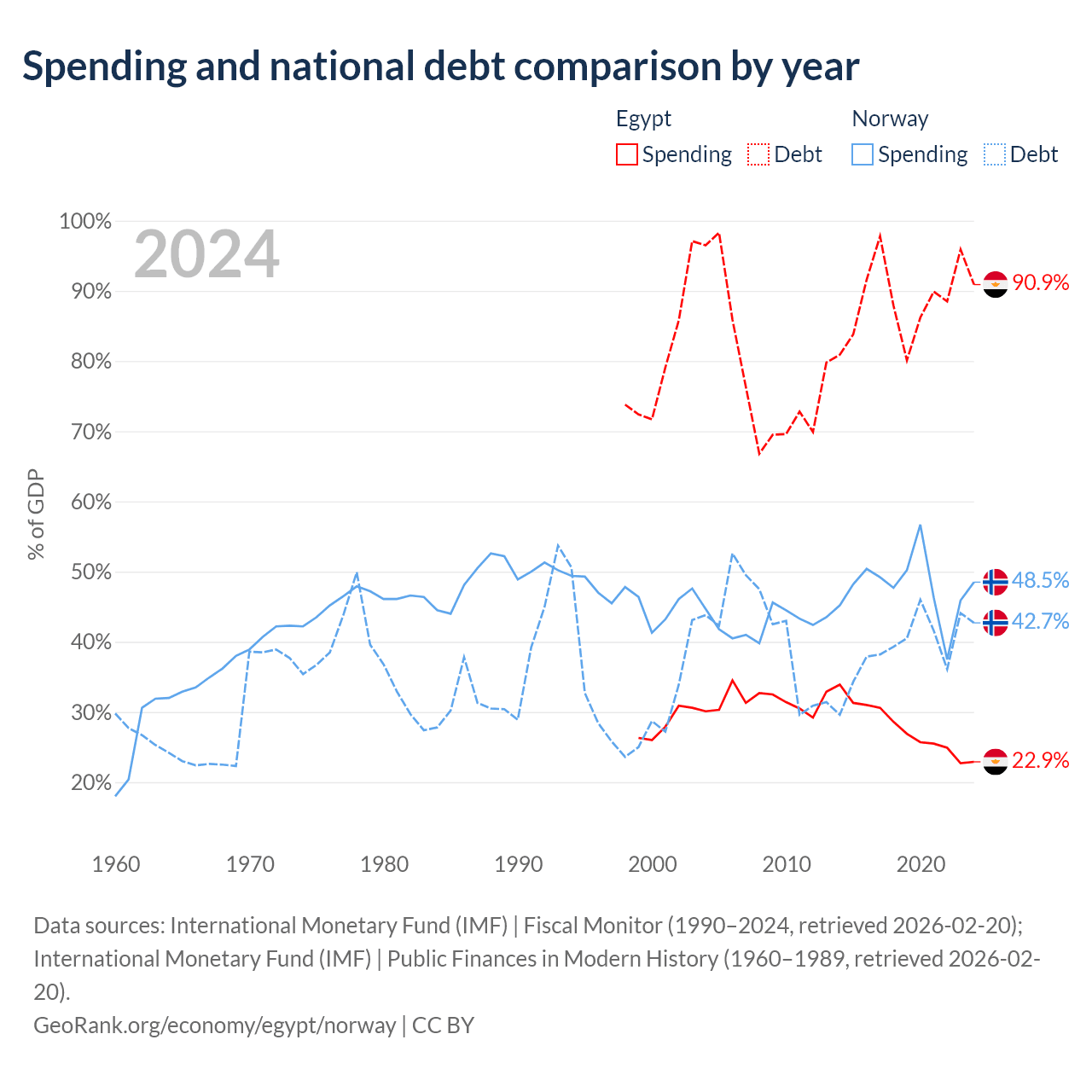 Egypt has $354B in government debt (90.9% of GDP), compared to $207B (42.7% of GDP) in Norway.