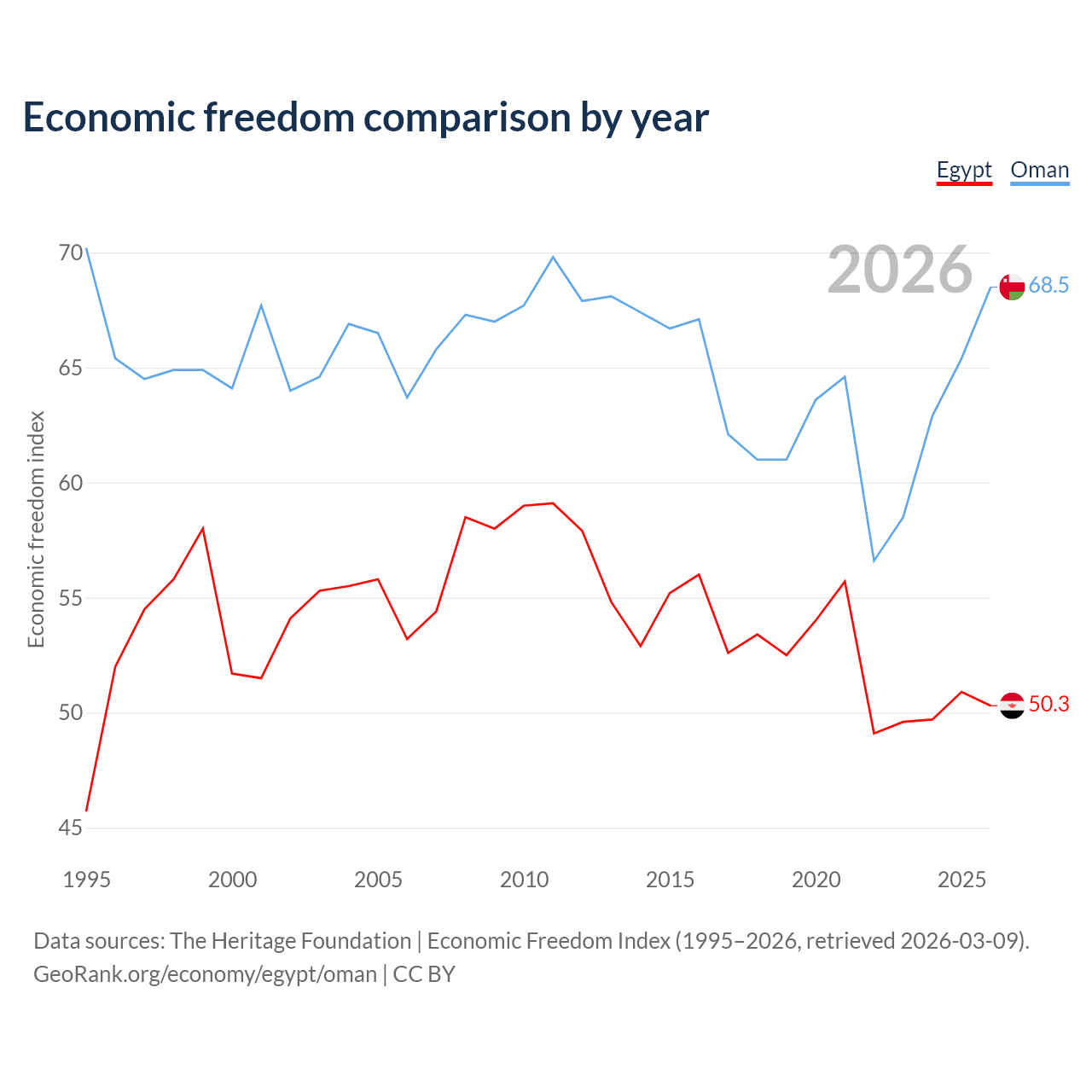 The Economic Freedom Index for Egypt is 50.3, ranking 160/197, compared to 68.5 for Oman, ranking 45/197. The chart above displays a comparison of annual changes in economic freedom indexes.