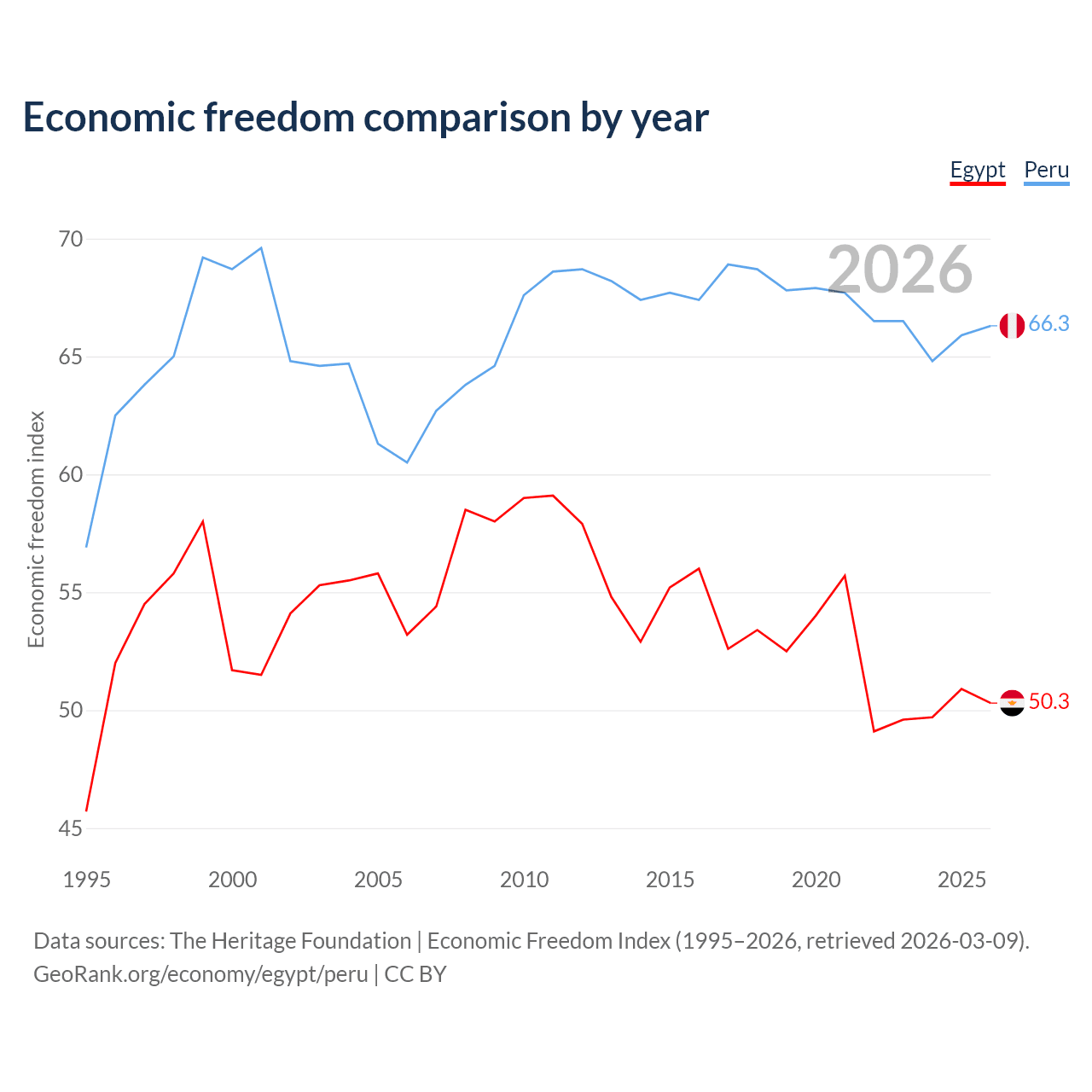 The Economic Freedom Index for Egypt is 50.3, ranking 160/197, compared to 66.3 for Peru, ranking 62/197. The chart above displays a comparison of annual changes in economic freedom indexes.