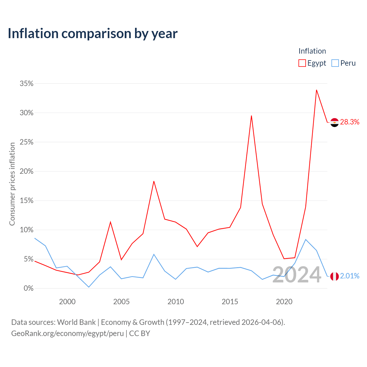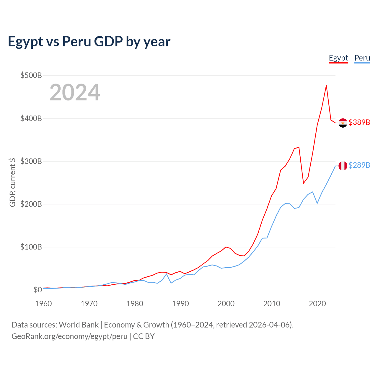 Egypt has a GDP of $389B compared to $289B for Peru, ranking 41/197 and 49/197 by economy size, respectively.