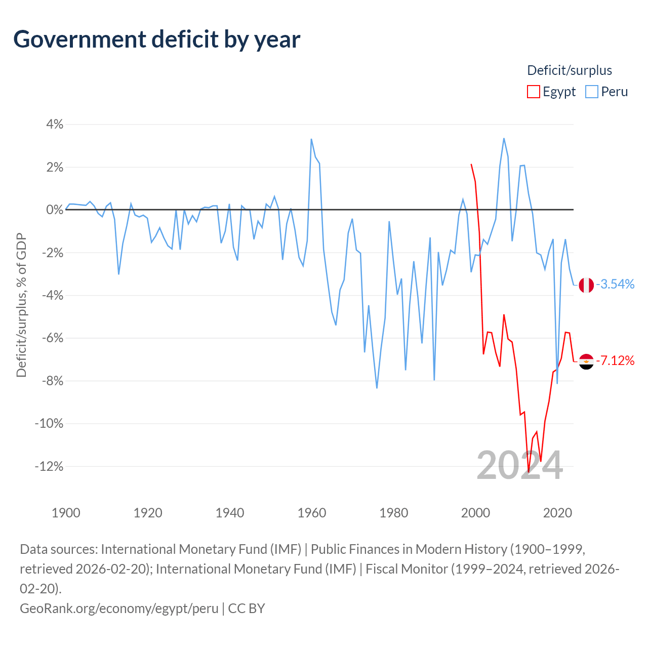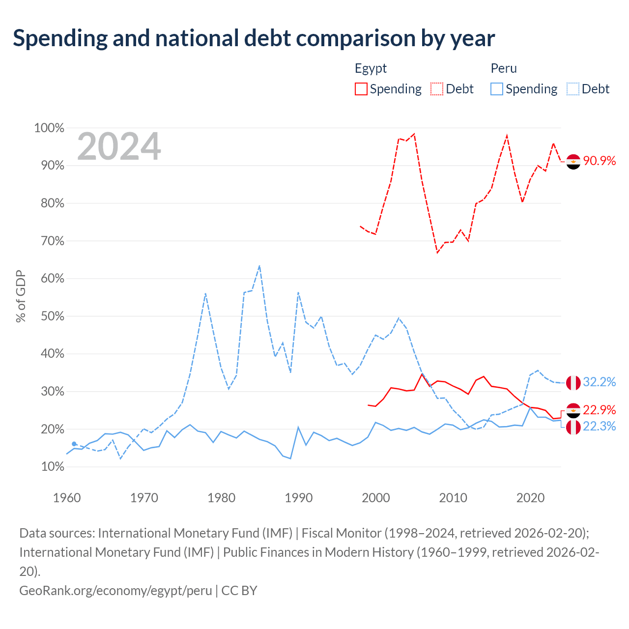 Egypt has $354B in government debt (90.9% of GDP), compared to $93B (32.2% of GDP) in Peru.