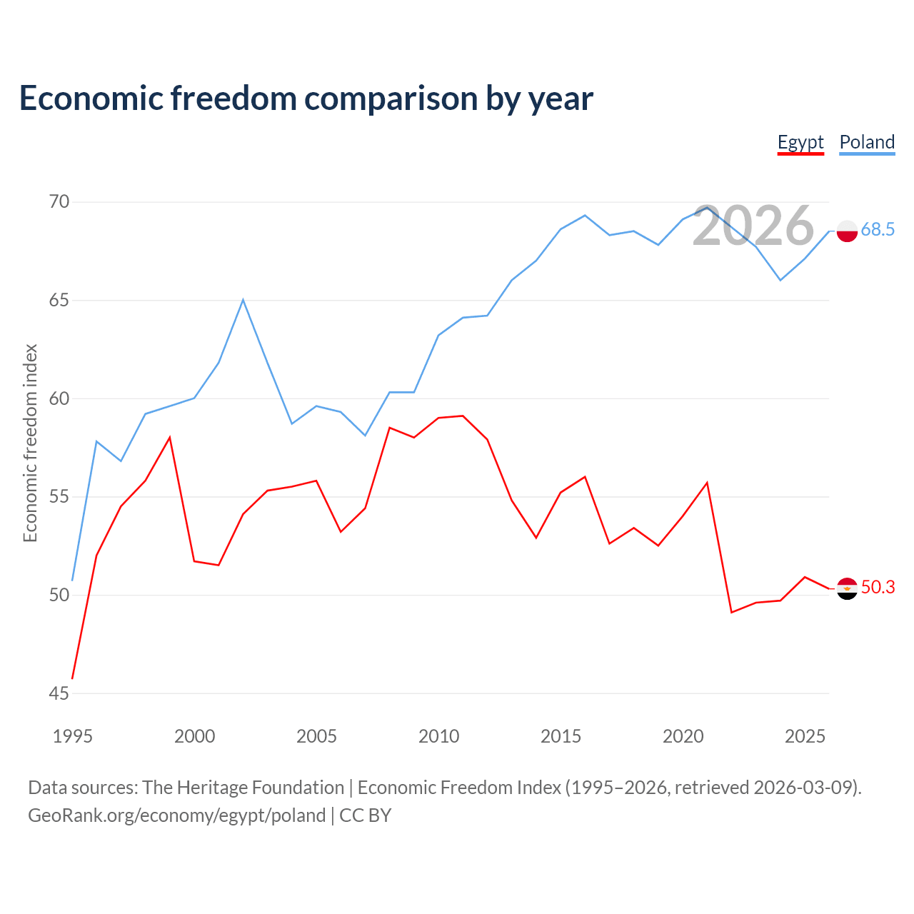 The Economic Freedom Index for Egypt is 50.3, ranking 160/197, compared to 68.5 for Poland, ranking 46/197. The chart above displays a comparison of annual changes in economic freedom indexes.