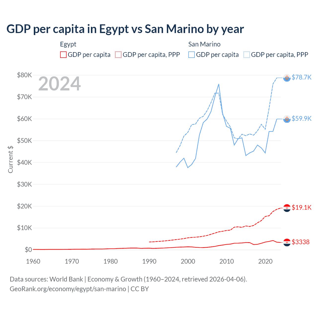GDP per capita in Egypt vs San Marino by year
