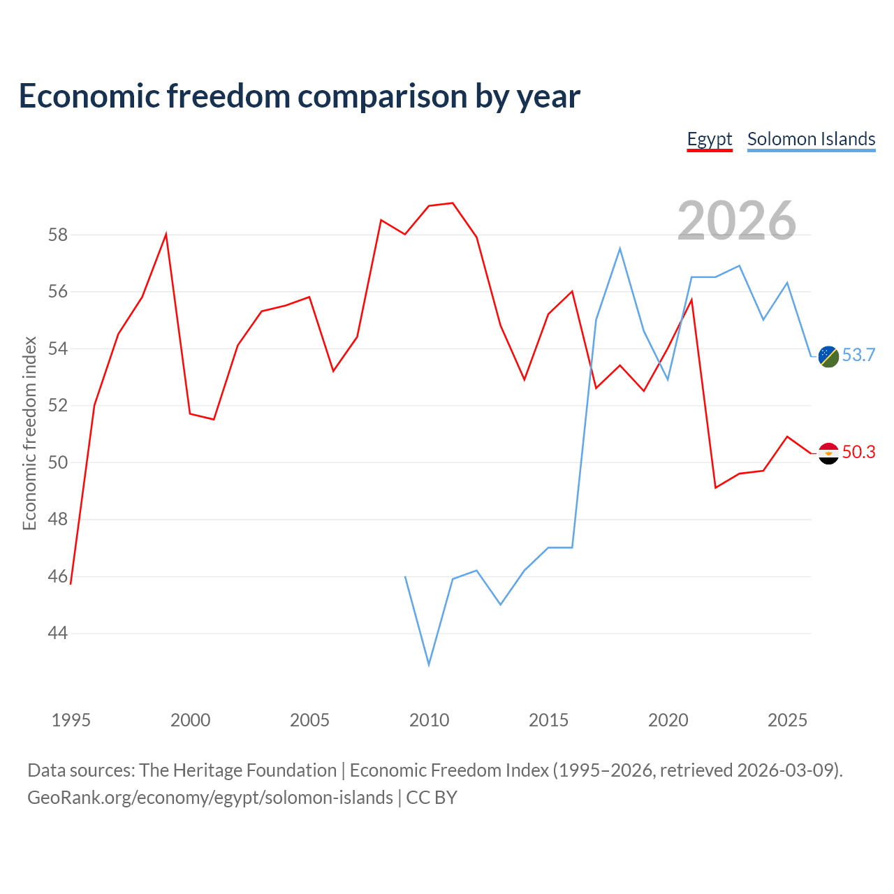The Economic Freedom Index for Egypt is 50.3, ranking 160/197, compared to 53.7 for the Solomon Islands, ranking 137/197. The chart above displays a comparison of annual changes in economic freedom indexes.