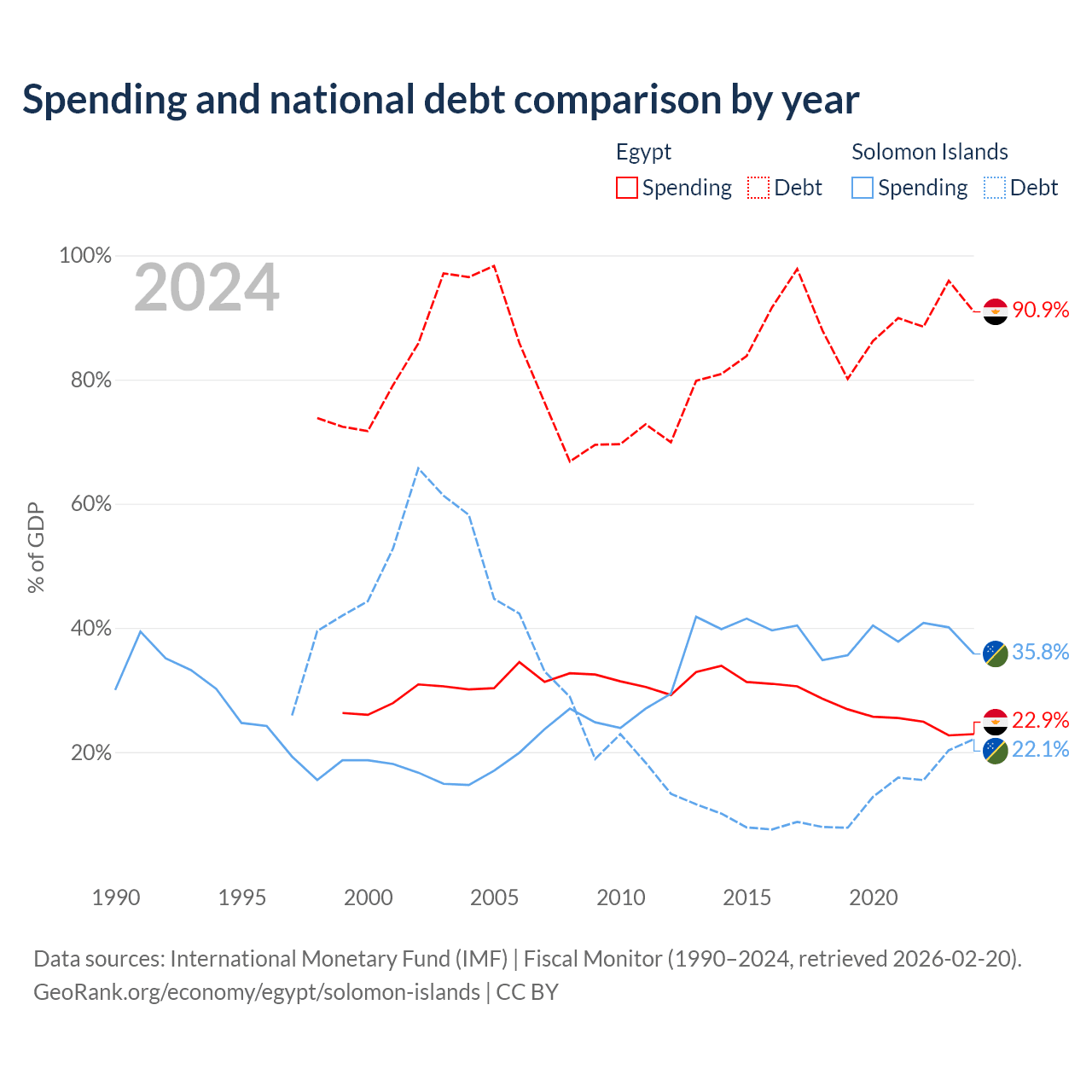 Egypt has $354B in government debt (90.9% of GDP), compared to $350M (22.1% of GDP) in the Solomon Islands.