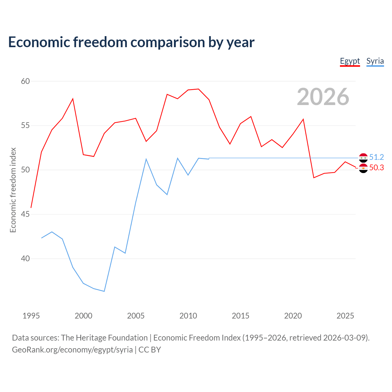 The Economic Freedom Index for Egypt is 50.3, ranking 160/197, compared to 51.2 for Syria, ranking 155/197. The chart above displays a comparison of annual changes in economic freedom indexes.