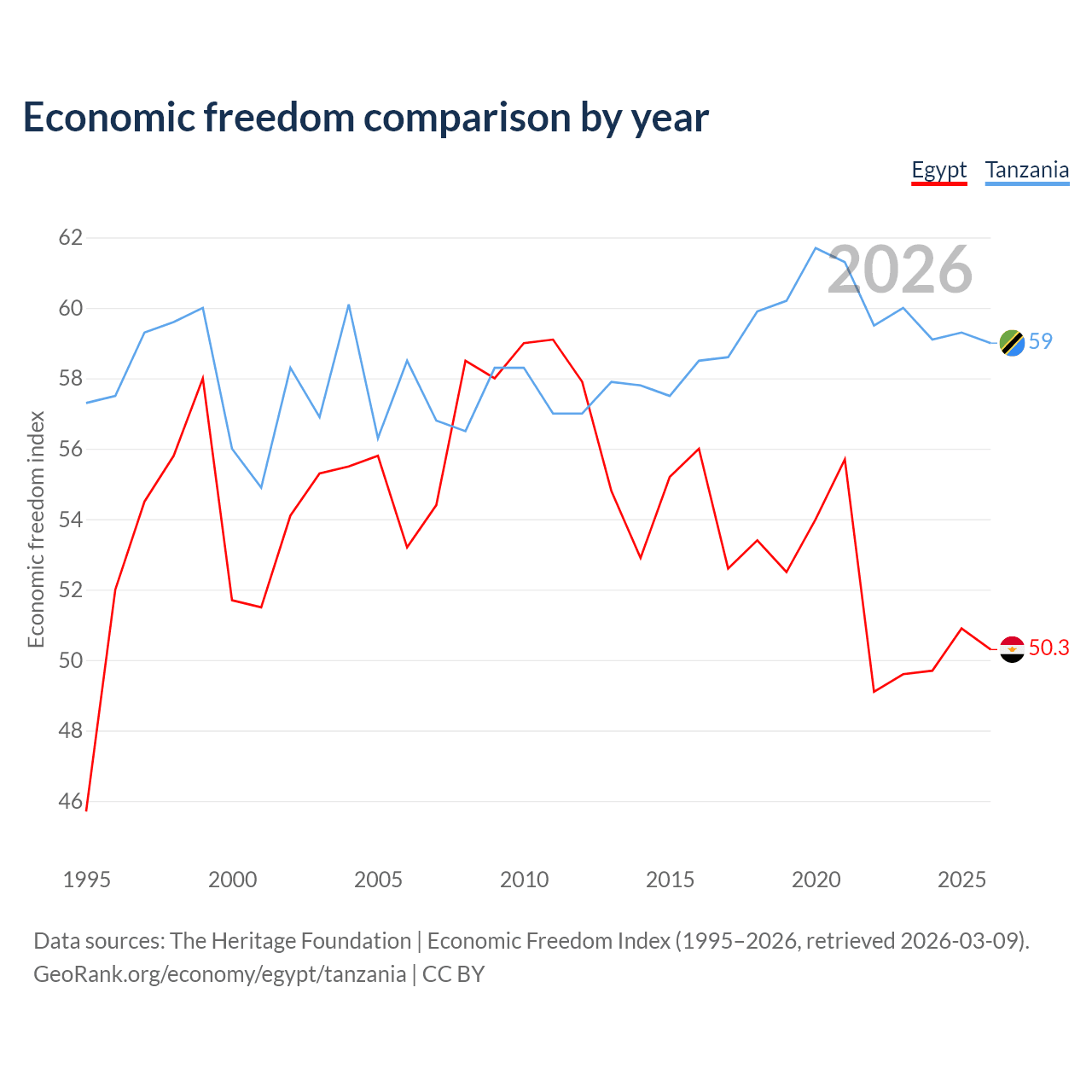 The Economic Freedom Index for Egypt is 50.3, ranking 160/197, compared to 59 for Tanzania, ranking 106/197. The chart above displays a comparison of annual changes in economic freedom indexes.