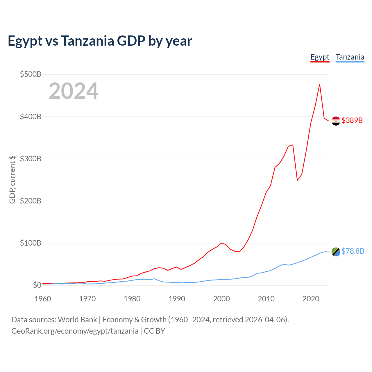Egypt has a GDP of $389B compared to $78.8B for Tanzania, ranking 41/197 and 82/197 by economy size, respectively.