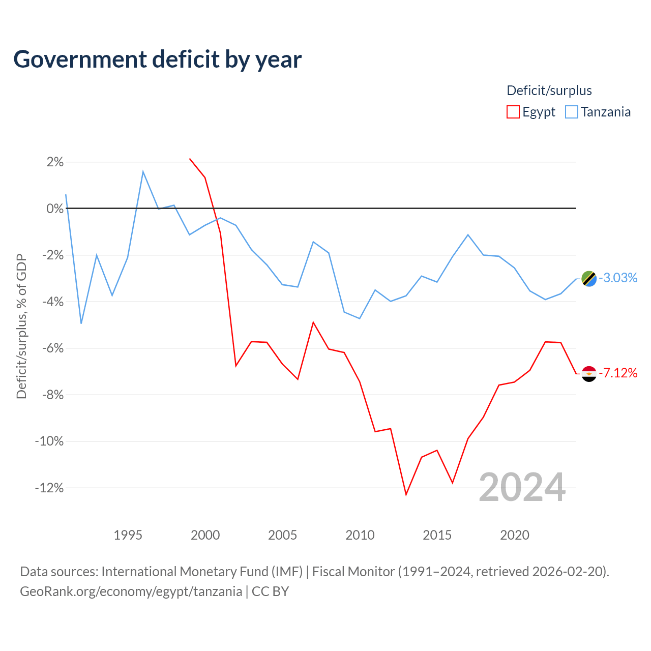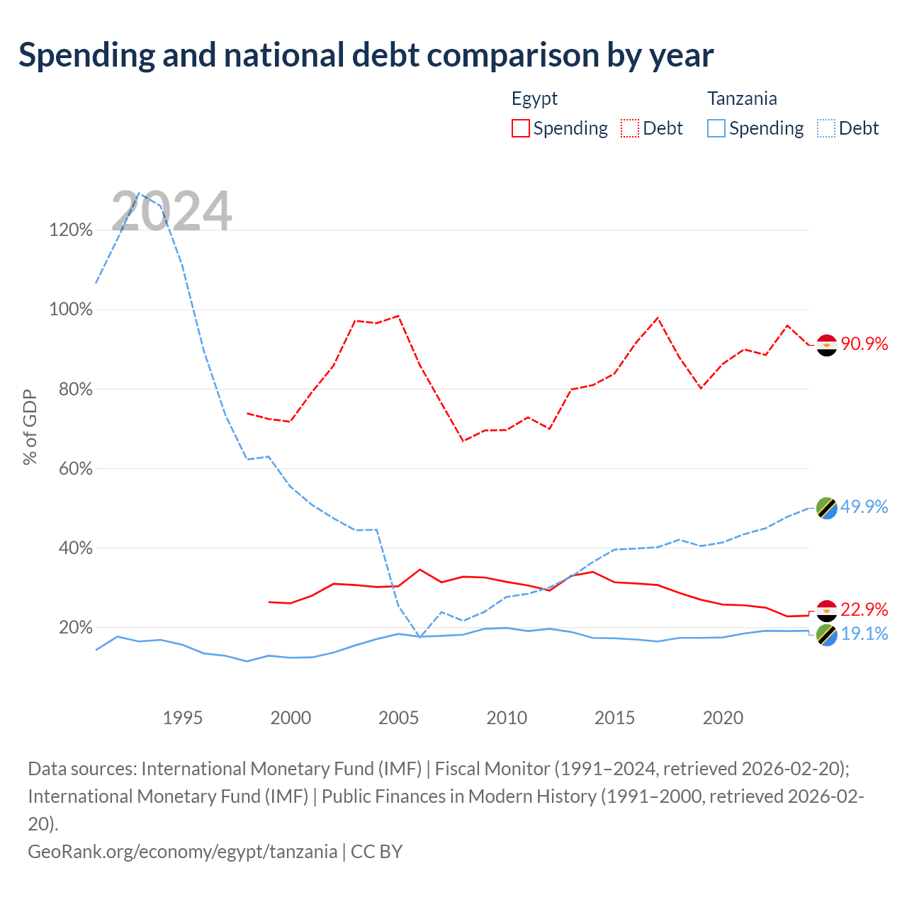 Egypt has $354B in government debt (90.9% of GDP), compared to $39.3B (49.9% of GDP) in Tanzania.
