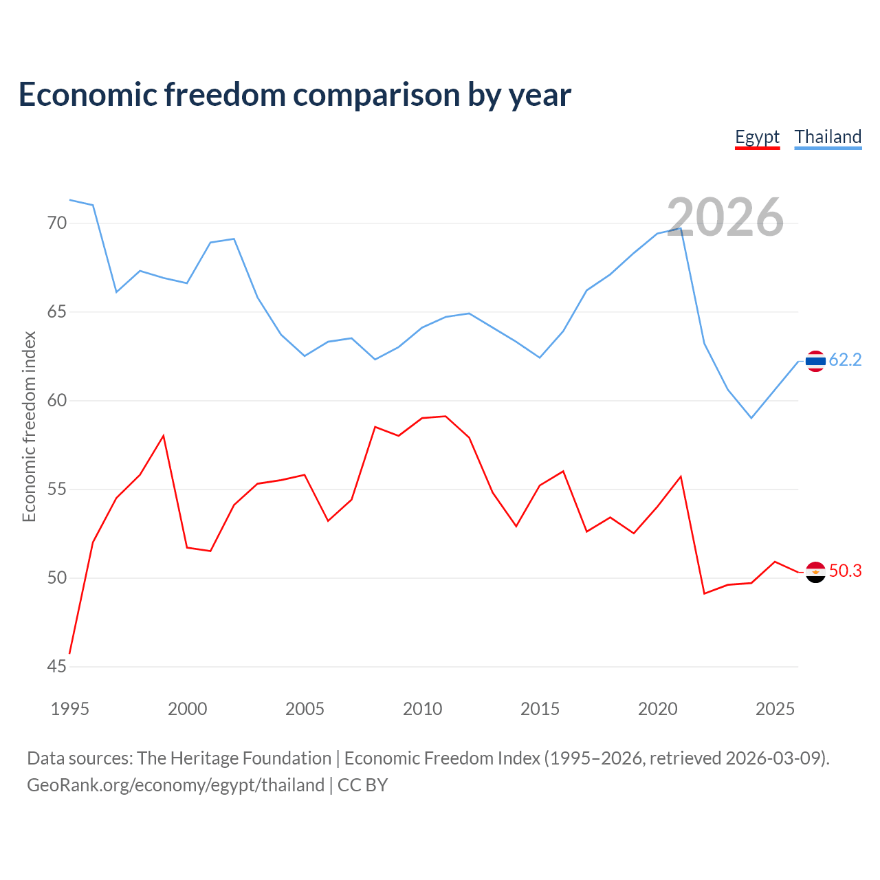The Economic Freedom Index for Egypt is 50.3, ranking 160/197, compared to 62.2 for Thailand, ranking 88/197. The chart above displays a comparison of annual changes in economic freedom indexes.