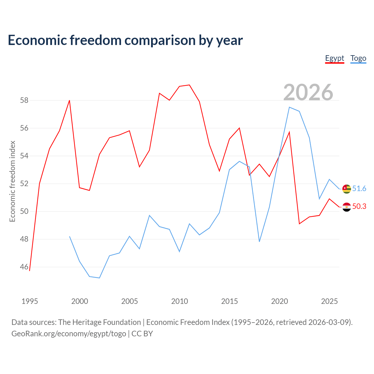 The Economic Freedom Index for Egypt is 50.3, ranking 160/197, compared to 51.6 for Togo, ranking 153/197. The chart above displays a comparison of annual changes in economic freedom indexes.