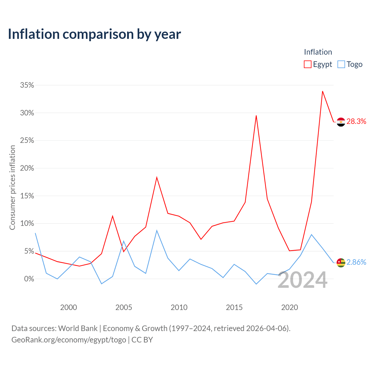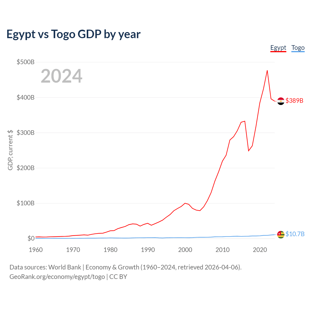 Egypt has a GDP of $389B compared to $10.7B for Togo, ranking 41/197 and 154/197 by economy size, respectively.