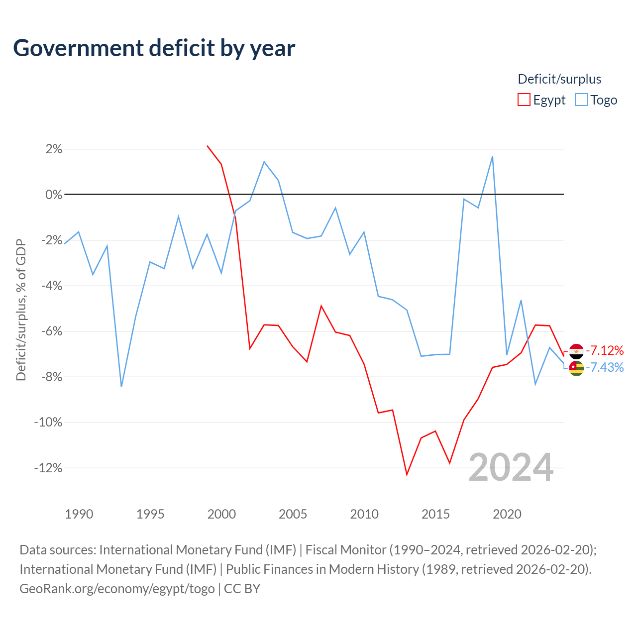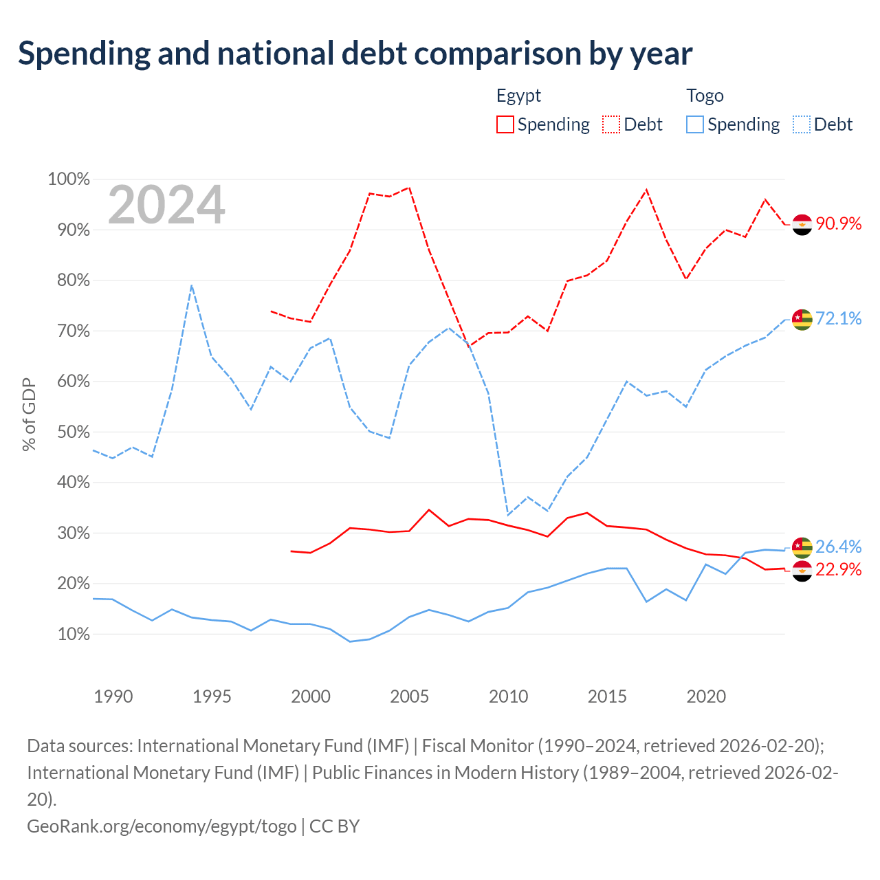 Egypt has $354B in government debt (90.9% of GDP), compared to $7.68B (72.1% of GDP) in Togo.