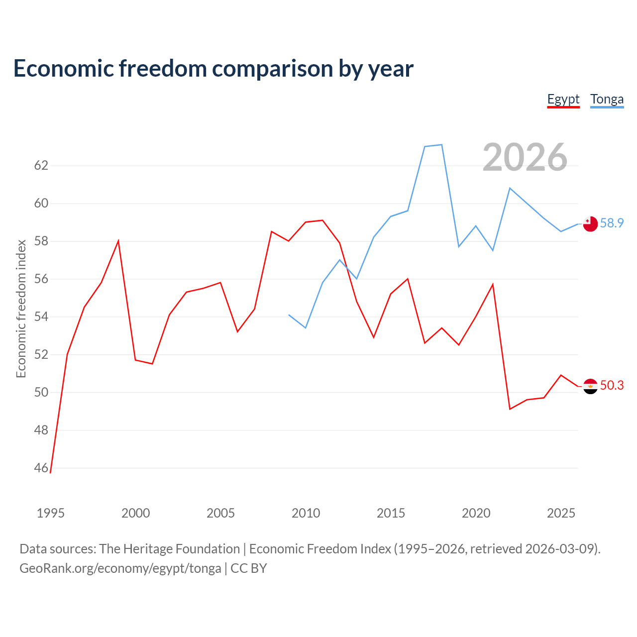 The Economic Freedom Index for Egypt is 50.3, ranking 160/197, compared to 58.9 for Tonga, ranking 107/197. The chart above displays a comparison of annual changes in economic freedom indexes.