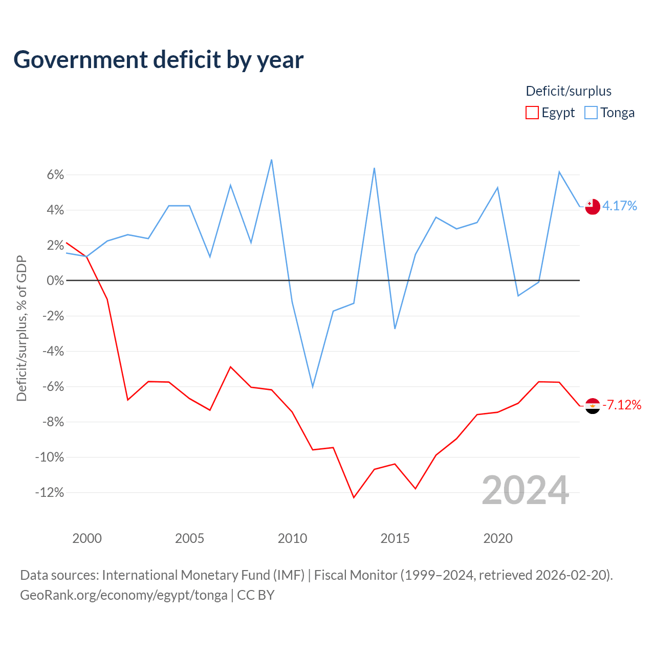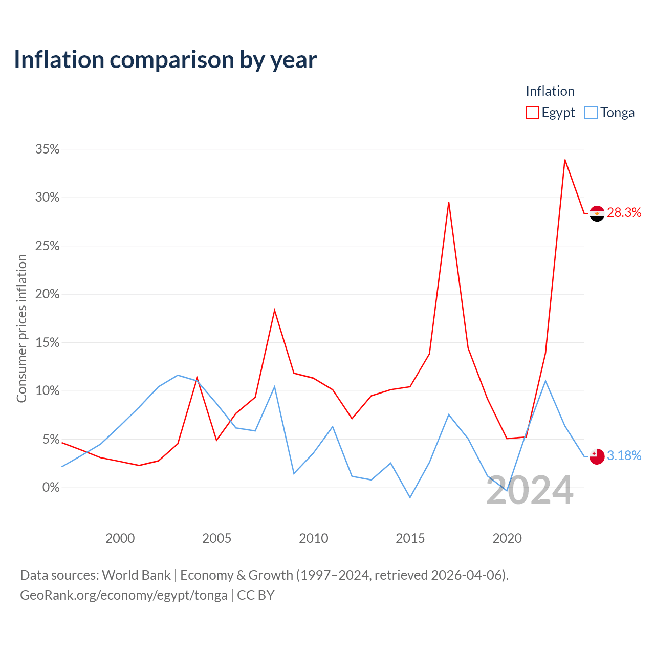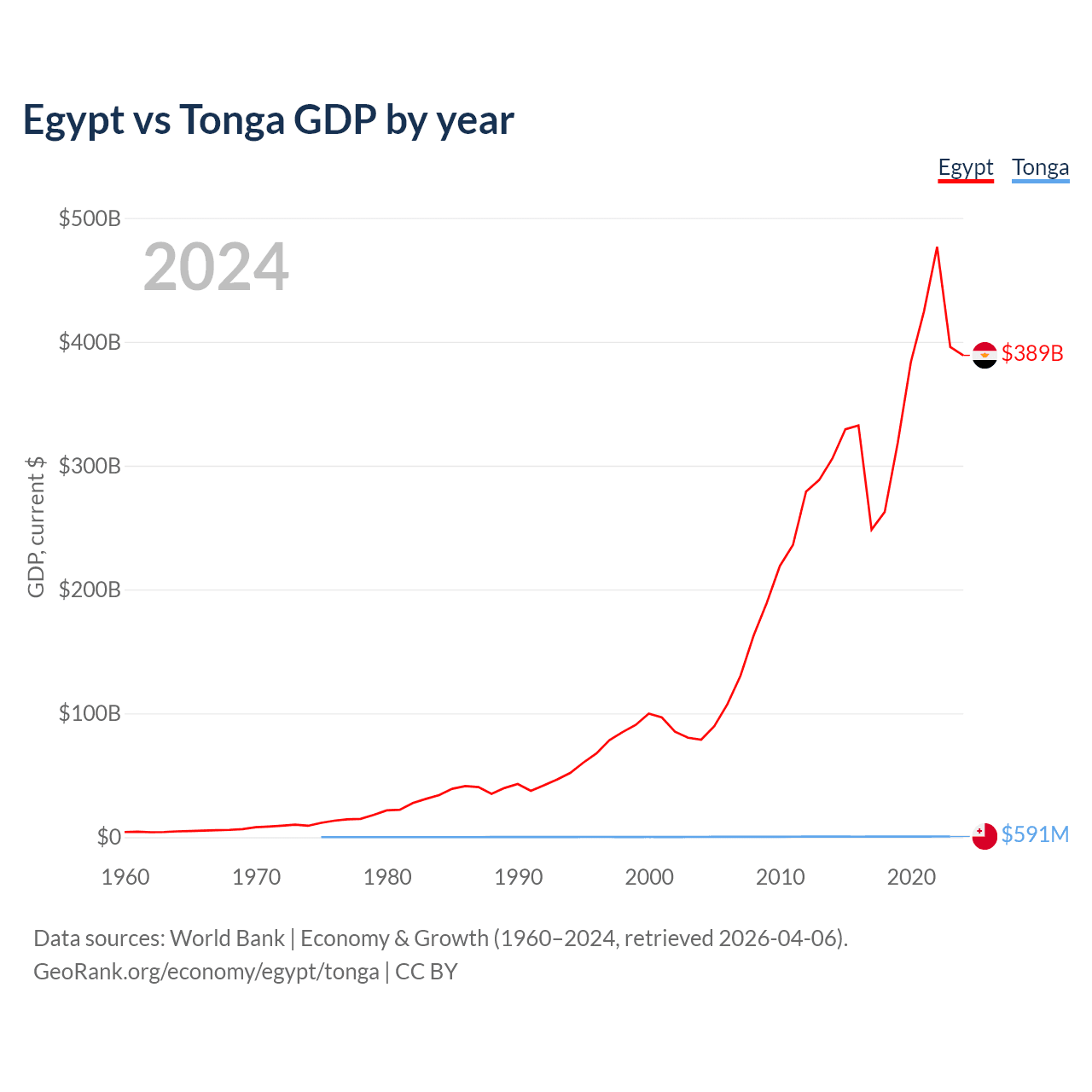 Egypt has a GDP of $389B compared to $591M for Tonga, ranking 41/197 and 191/197 by economy size, respectively.