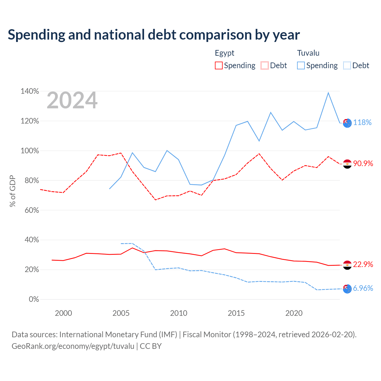 Egypt has $354B in government debt (90.9% of GDP), compared to $4.15M (6.96% of GDP) in Tuvalu.