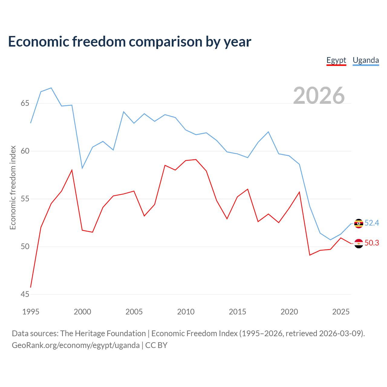 The Economic Freedom Index for Egypt is 50.3, ranking 160/197, compared to 52.4 for Uganda, ranking 149/197. The chart above displays a comparison of annual changes in economic freedom indexes.