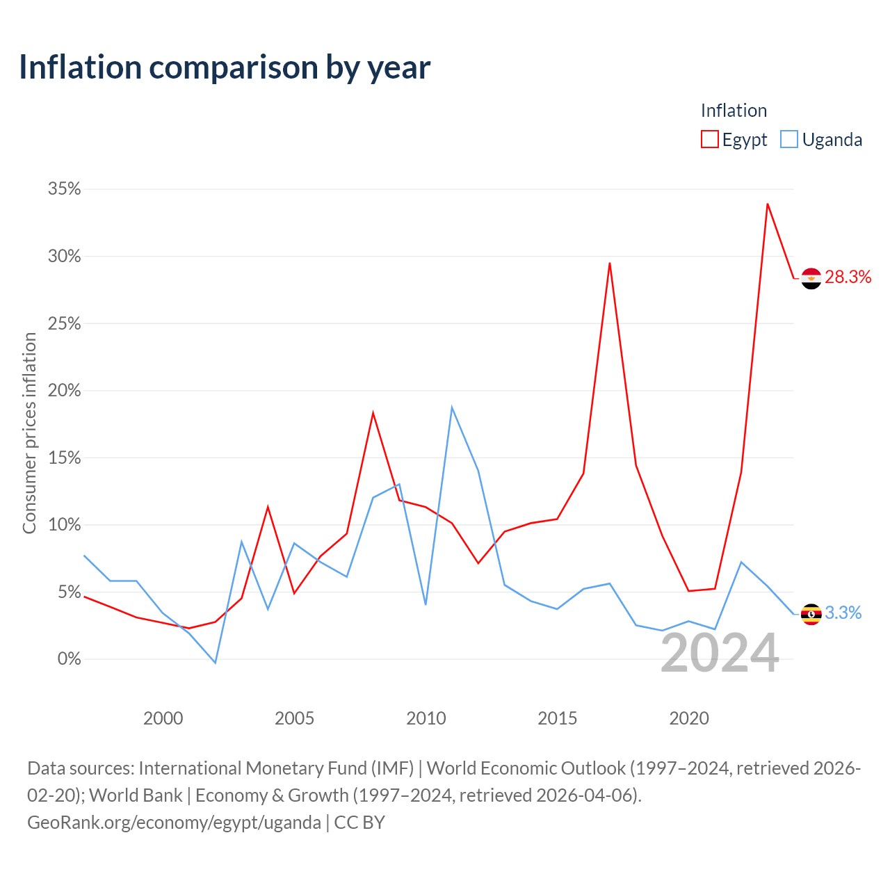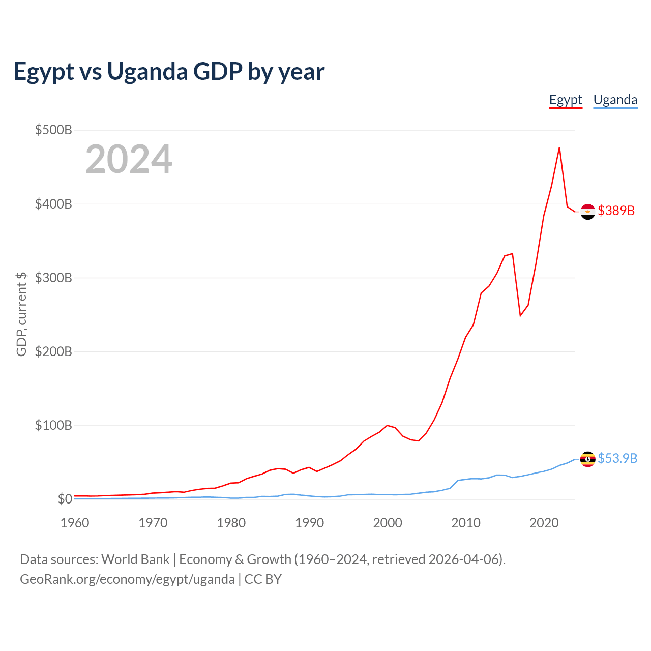 Egypt has a GDP of $389B compared to $53.9B for Uganda, ranking 41/197 and 89/197 by economy size, respectively.