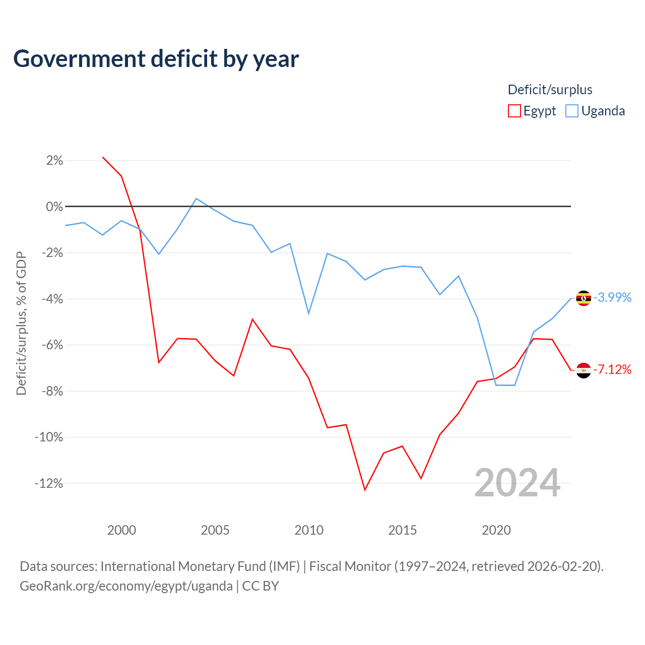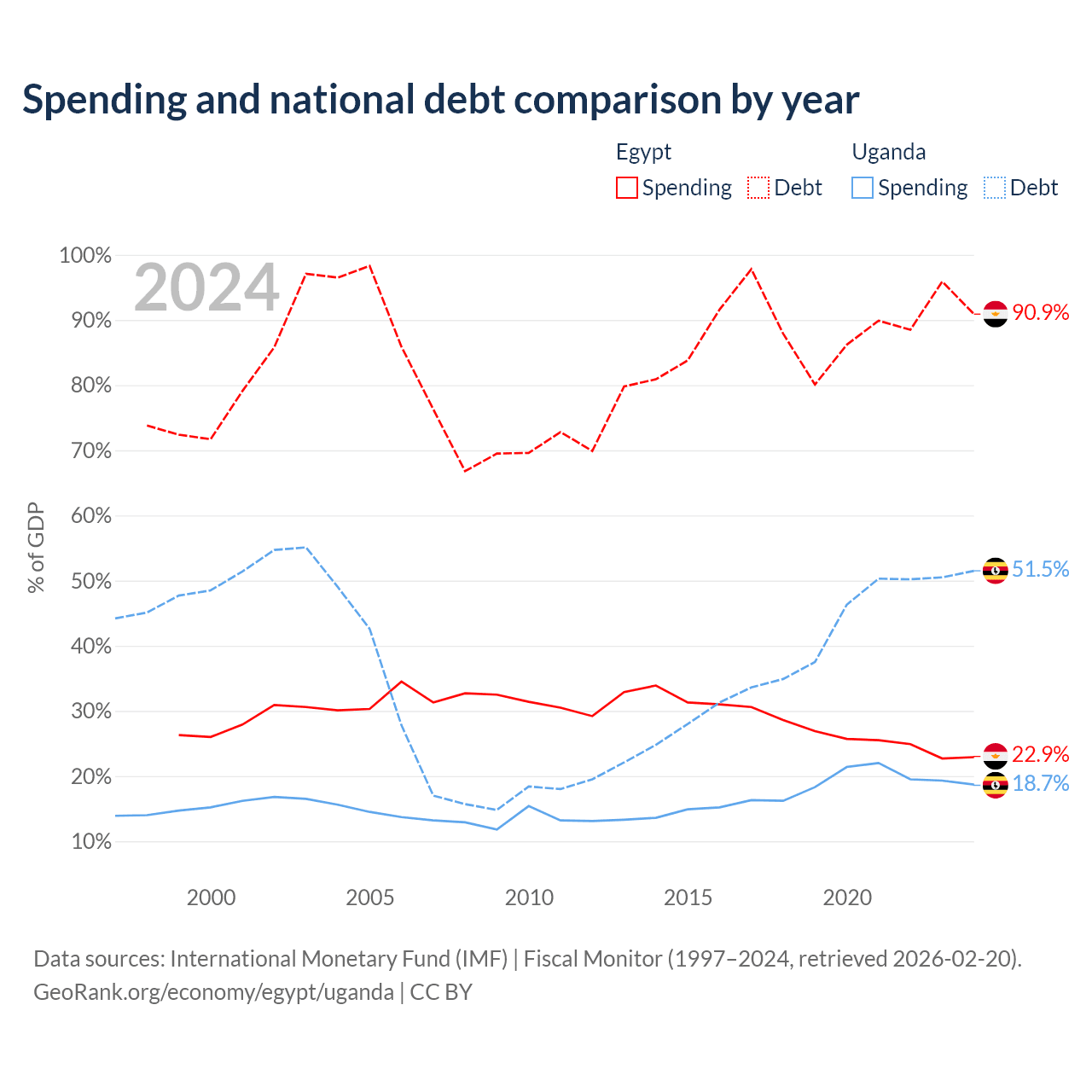 Egypt has $354B in government debt (90.9% of GDP), compared to $27.8B (51.5% of GDP) in Uganda.