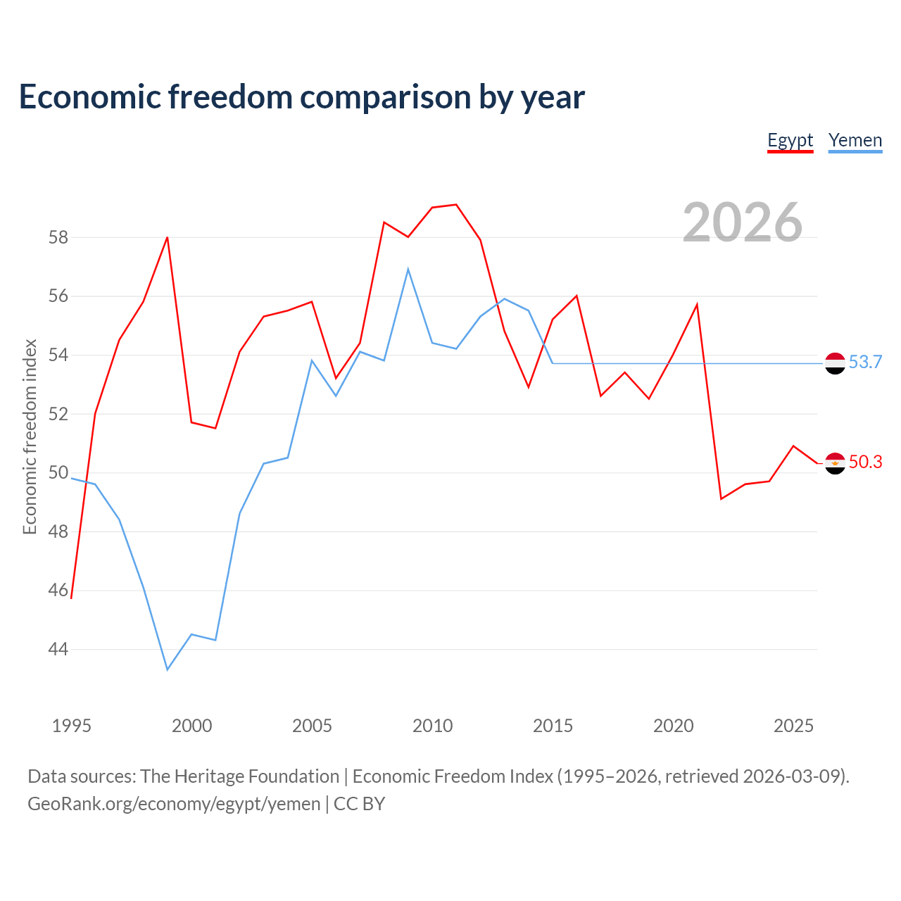 The Economic Freedom Index for Egypt is 50.3, ranking 160/197, compared to 53.7 for Yemen, ranking 138/197. The chart above displays a comparison of annual changes in economic freedom indexes.