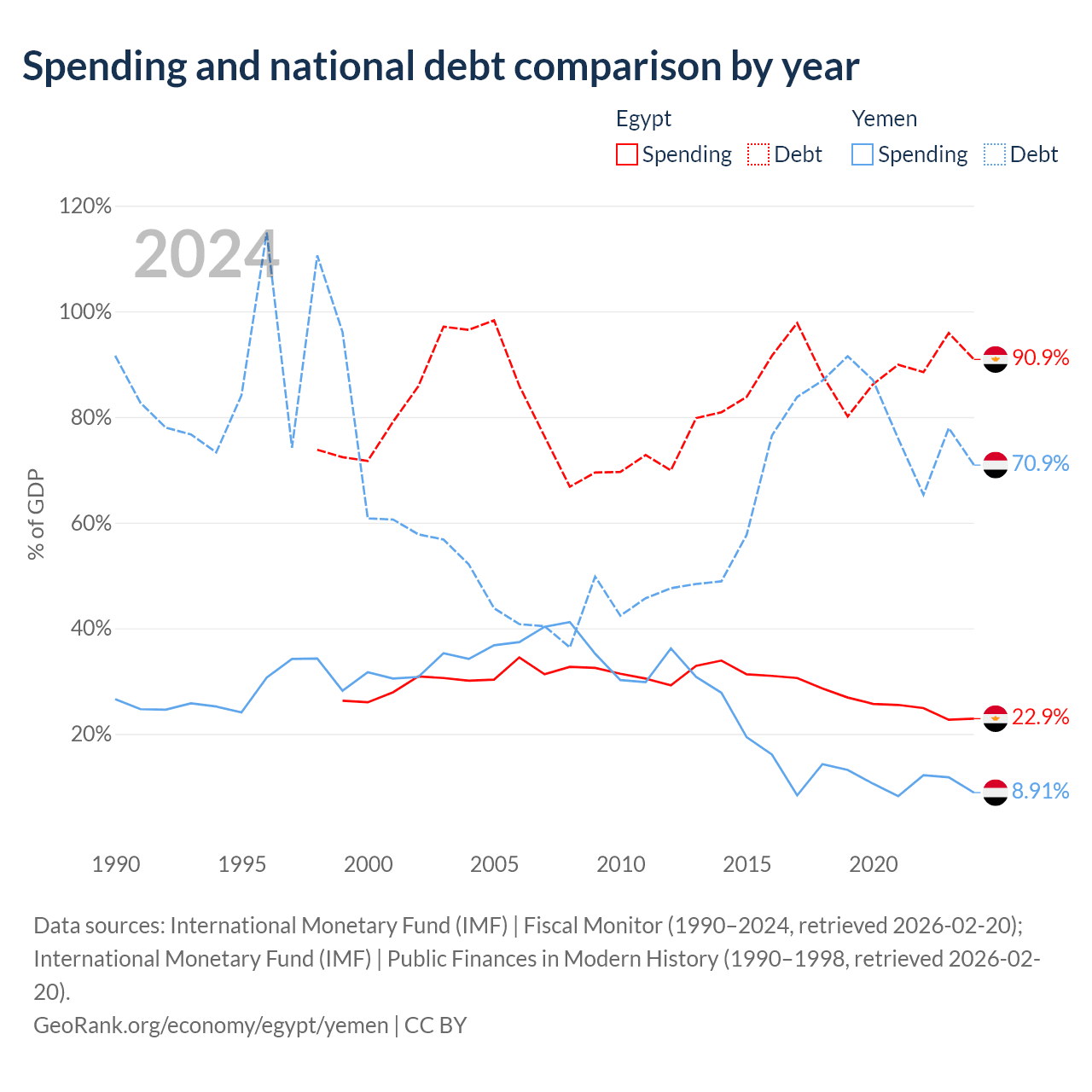Egypt has $354B in government debt (90.9% of GDP), compared to $18.8B (70.9% of GDP) in Yemen.