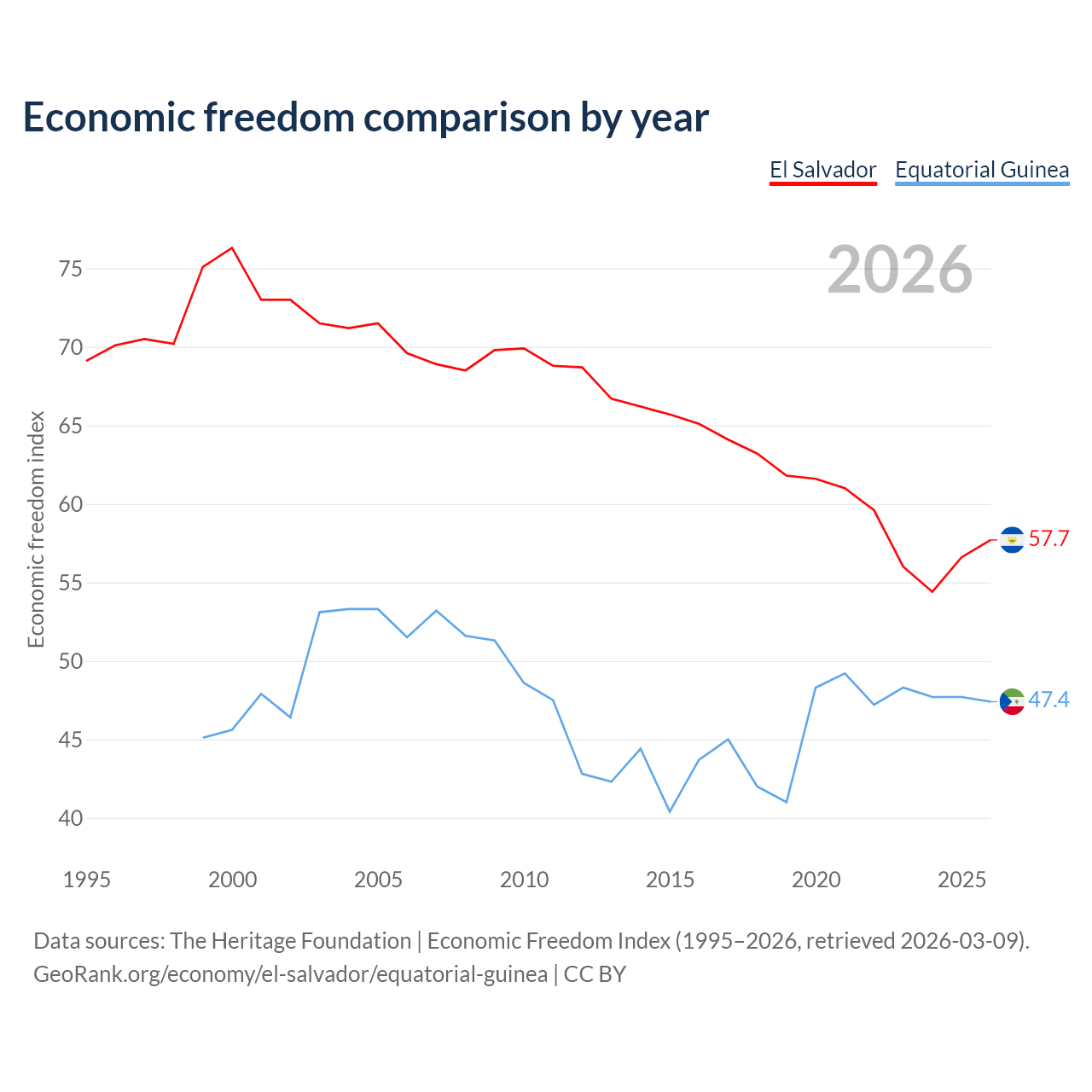 The Economic Freedom Index for El Salvador is 57.7, ranking 114/197, compared to 47.4 for Equatorial Guinea, ranking 175/197. The chart above displays a comparison of annual changes in economic freedom indexes.