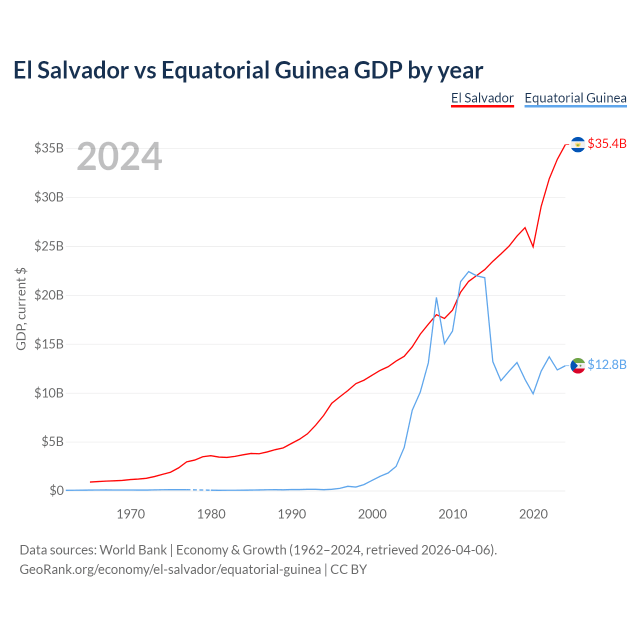 El Salvador has a GDP of $35.4B compared to $12.8B for Equatorial Guinea, ranking 105/197 and 148/197 by economy size, respectively.