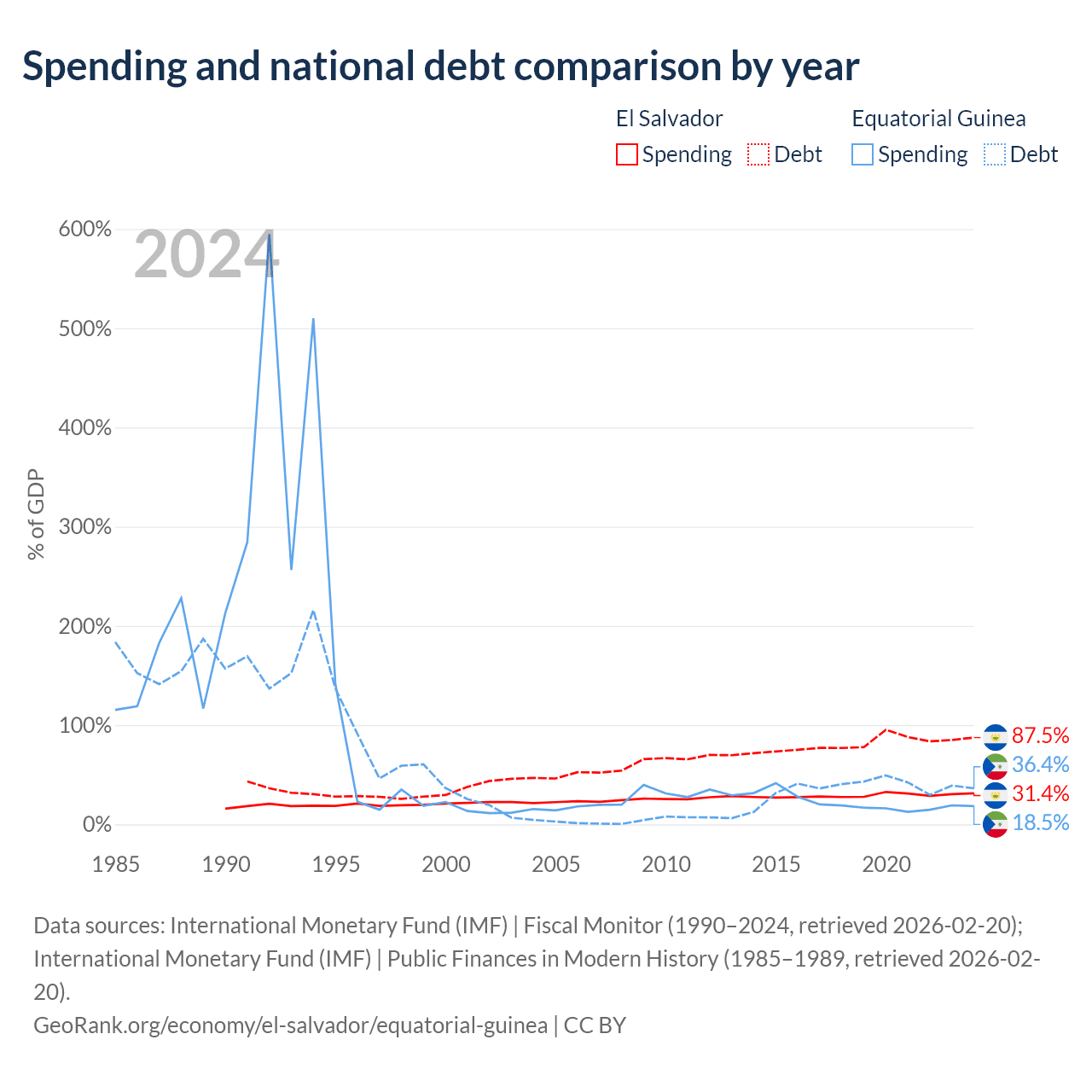 El Salvador has $30.9B in government debt (87.5% of GDP), compared to $4.65B (36.4% of GDP) in Equatorial Guinea.