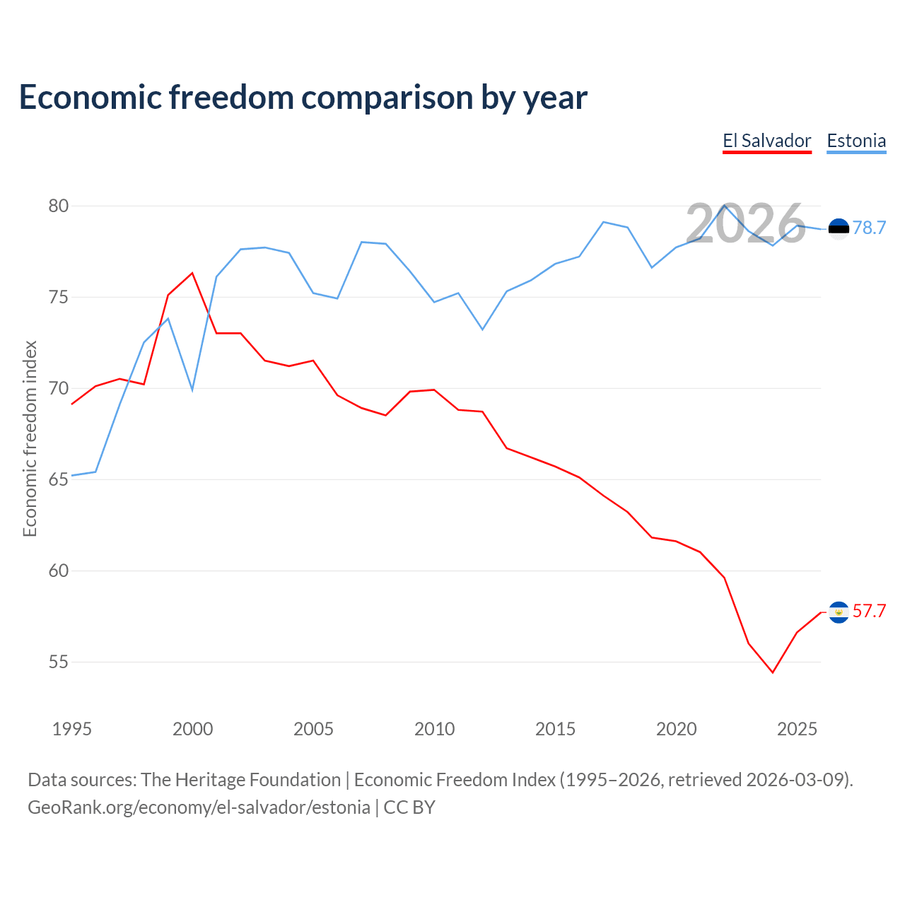 Data sources: The Heritage Foundation | Economic Freedom Index (1995–2026, retrieved 2026-03-09).