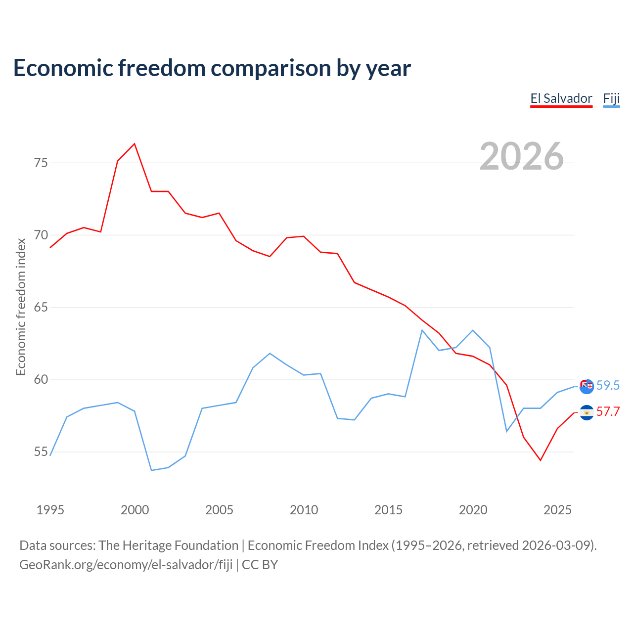 The Economic Freedom Index for El Salvador is 57.7, ranking 114/197, compared to 59.5 for Fiji, ranking 103/197. The chart above displays a comparison of annual changes in economic freedom indexes.