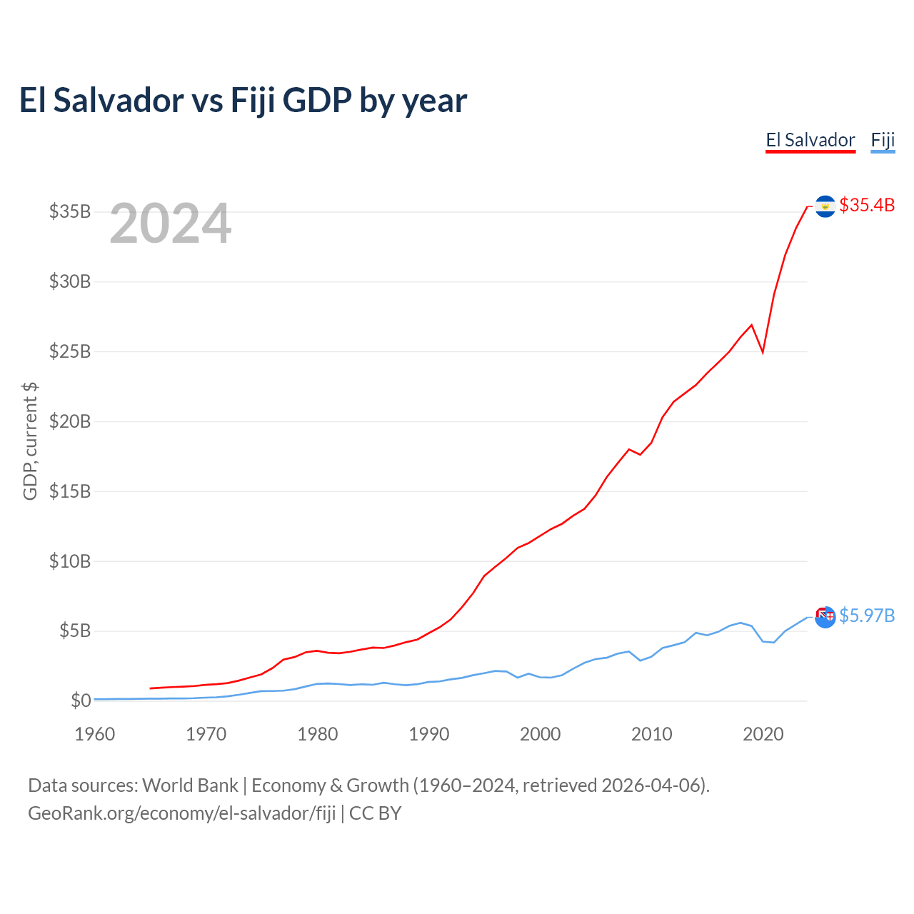 El Salvador has a GDP of $35.4B compared to $5.97B for Fiji, ranking 105/197 and 161/197 by economy size, respectively.