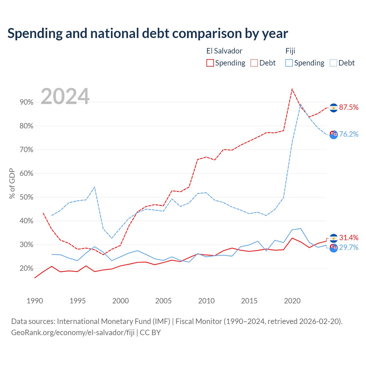 El Salvador has $30.9B in government debt (87.5% of GDP), compared to $4.54B (76.2% of GDP) in Fiji.