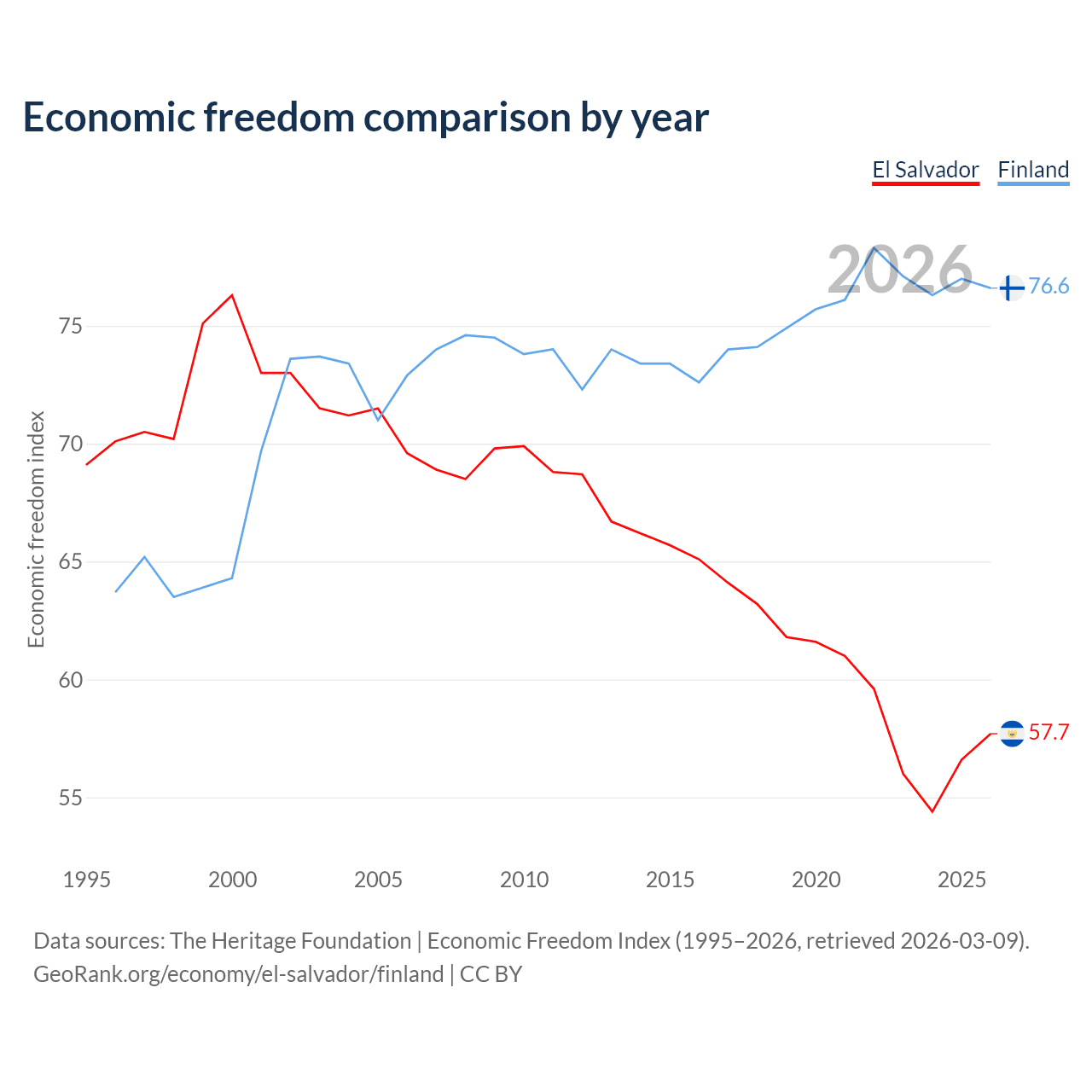 The Economic Freedom Index for El Salvador is 57.7, ranking 114/197, compared to 76.6 for Finland, ranking 15/197. The chart above displays a comparison of annual changes in economic freedom indexes.