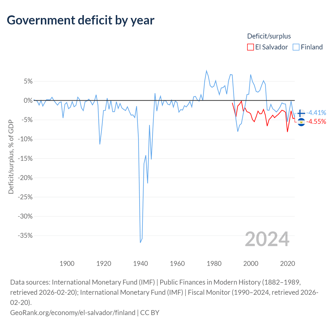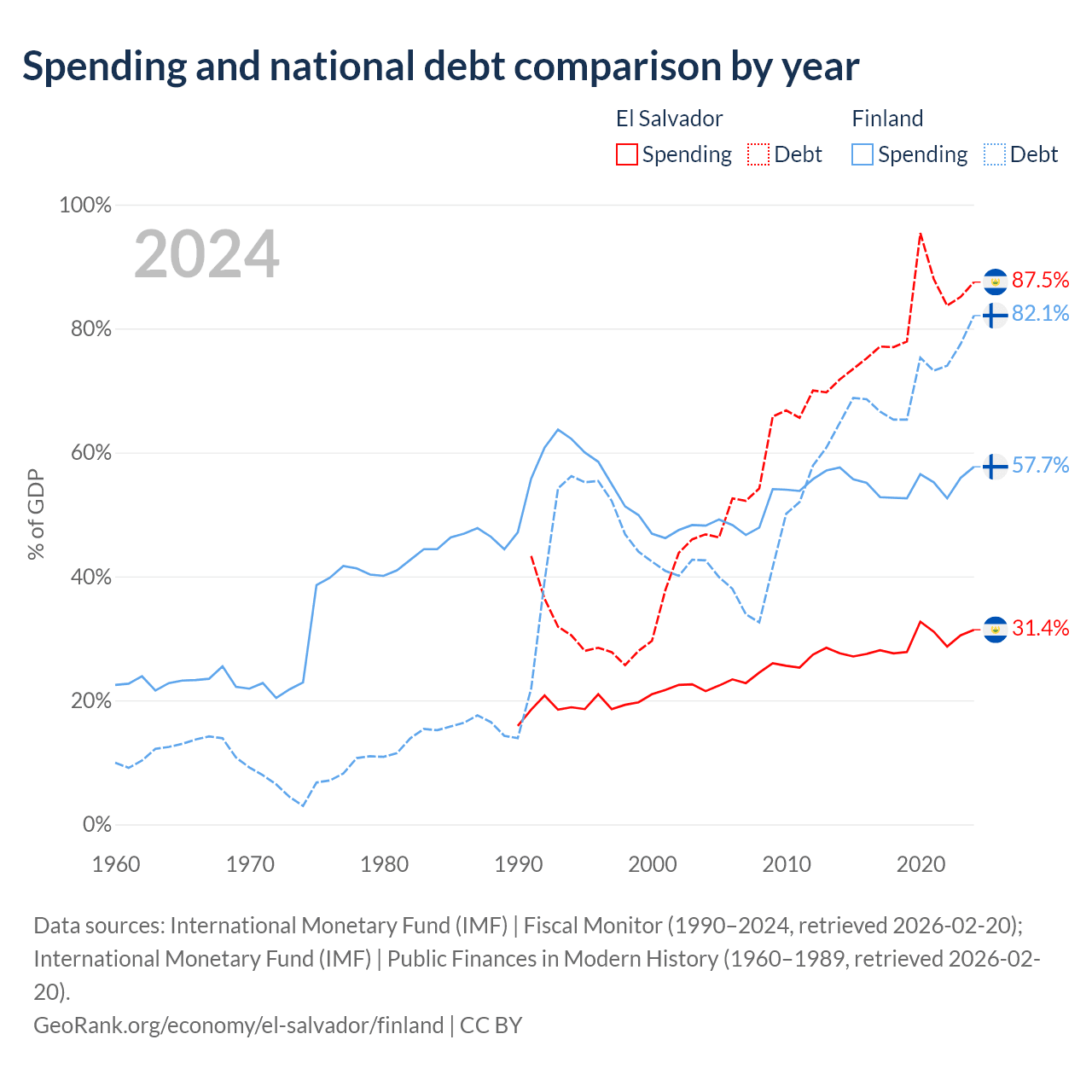 El Salvador has $30.9B in government debt (87.5% of GDP), compared to $245B (82.1% of GDP) in Finland.
