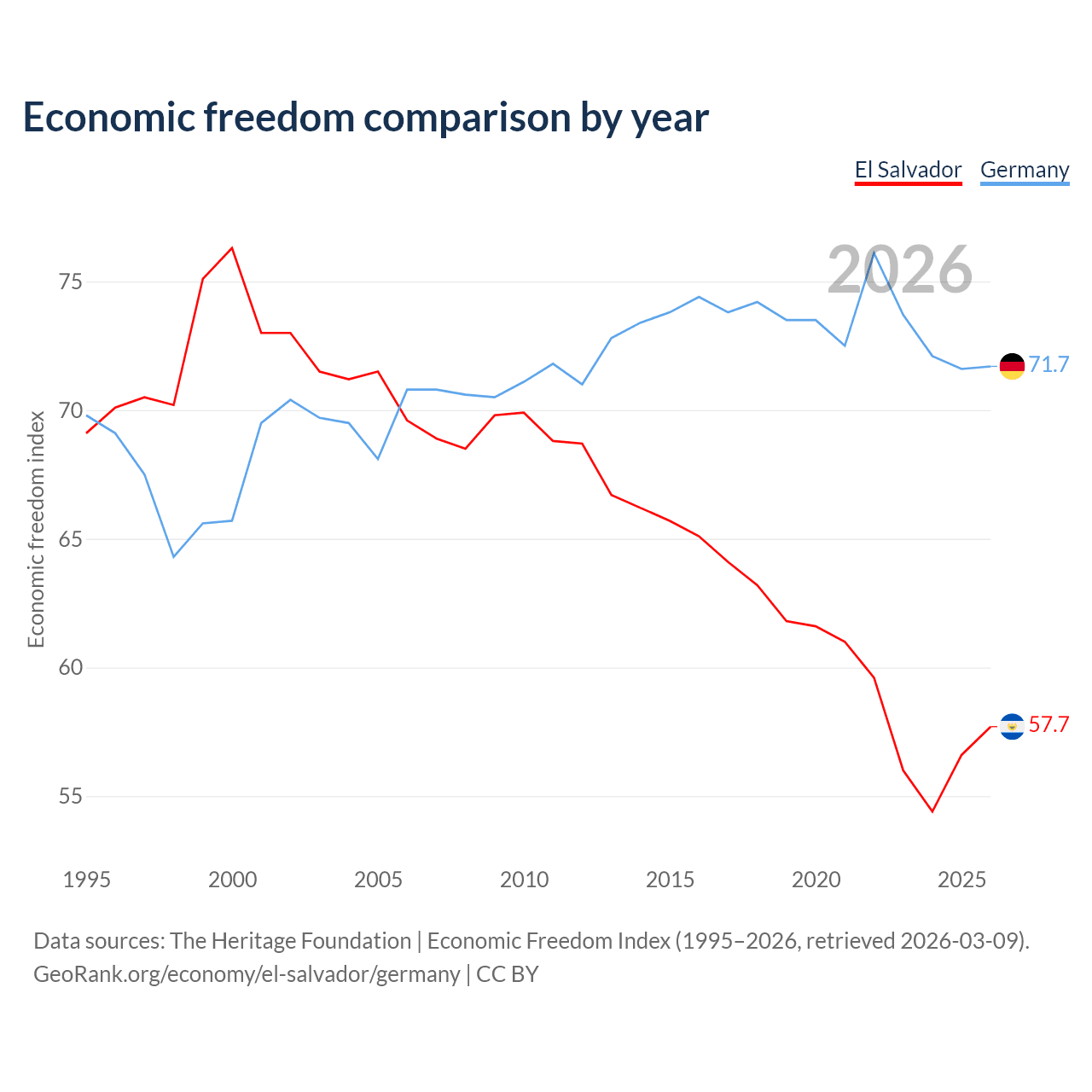 The Economic Freedom Index for El Salvador is 57.7, ranking 114/197, compared to 71.7 for Germany, ranking 30/197. The chart above displays a comparison of annual changes in economic freedom indexes.