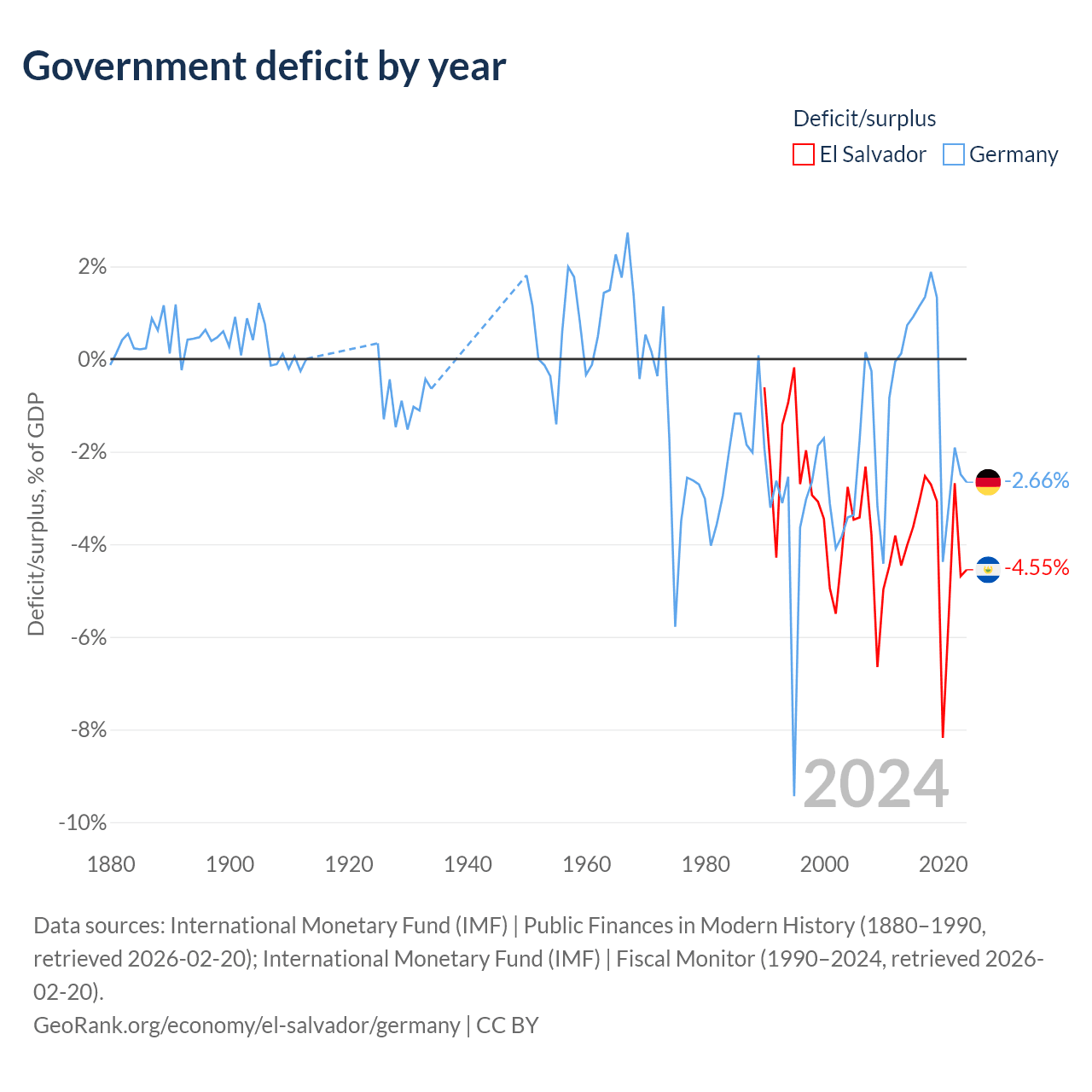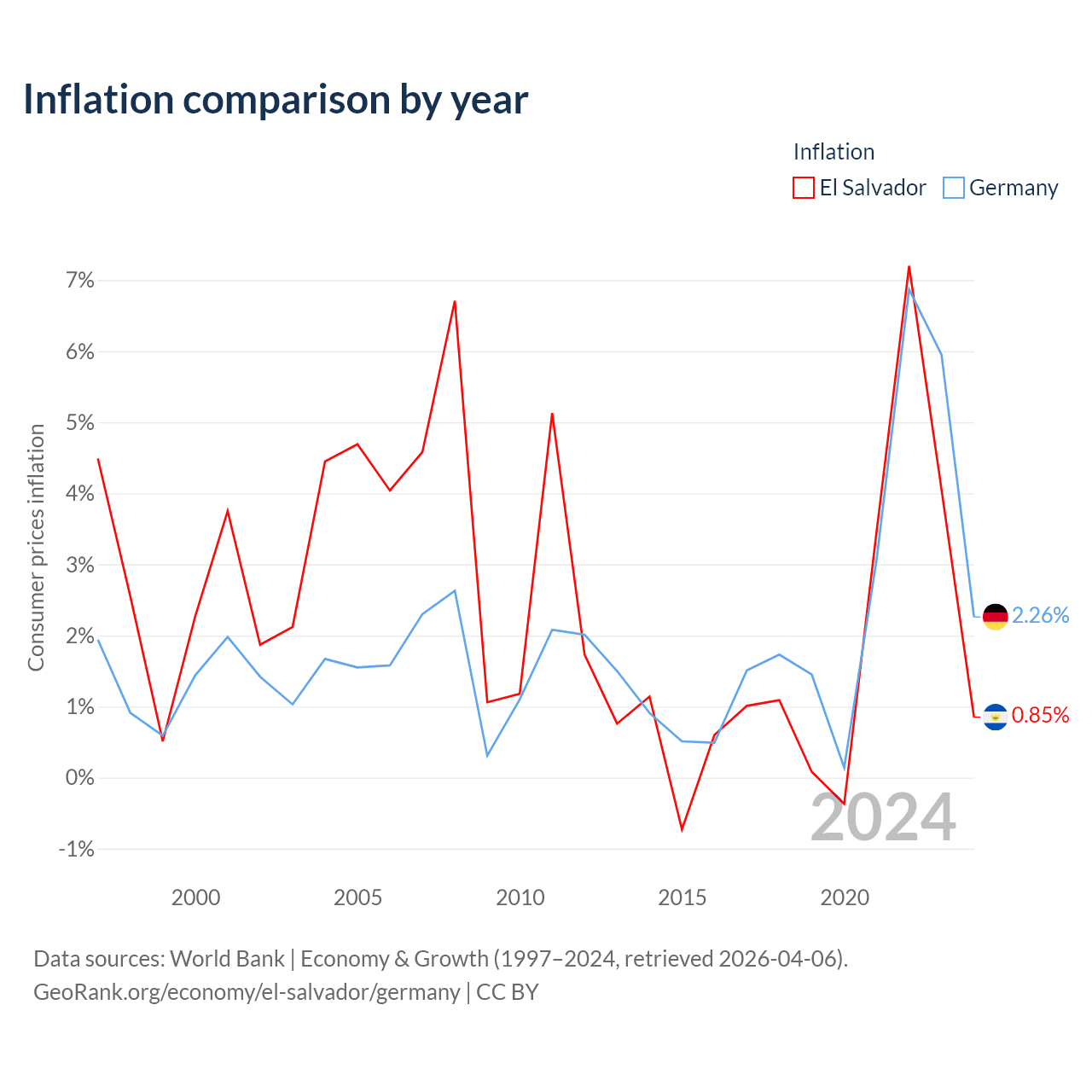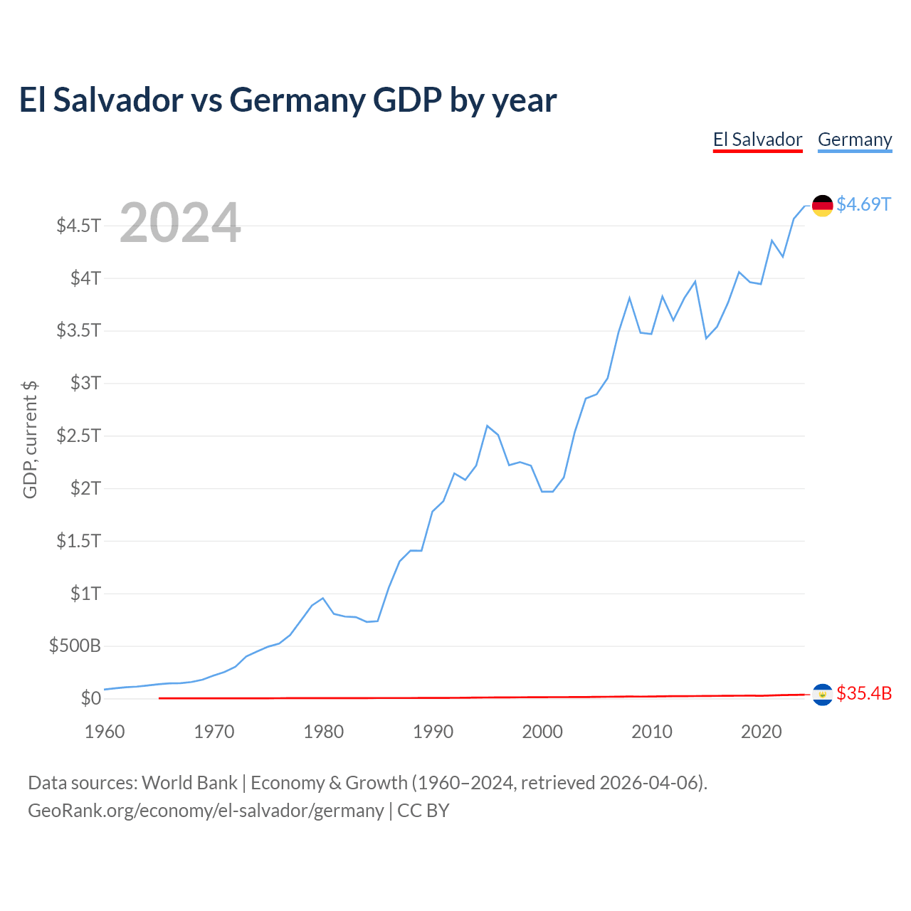 El Salvador has a GDP of $35.4B compared to $4.69T for Germany, ranking 105/197 and 3/197 by economy size, respectively.