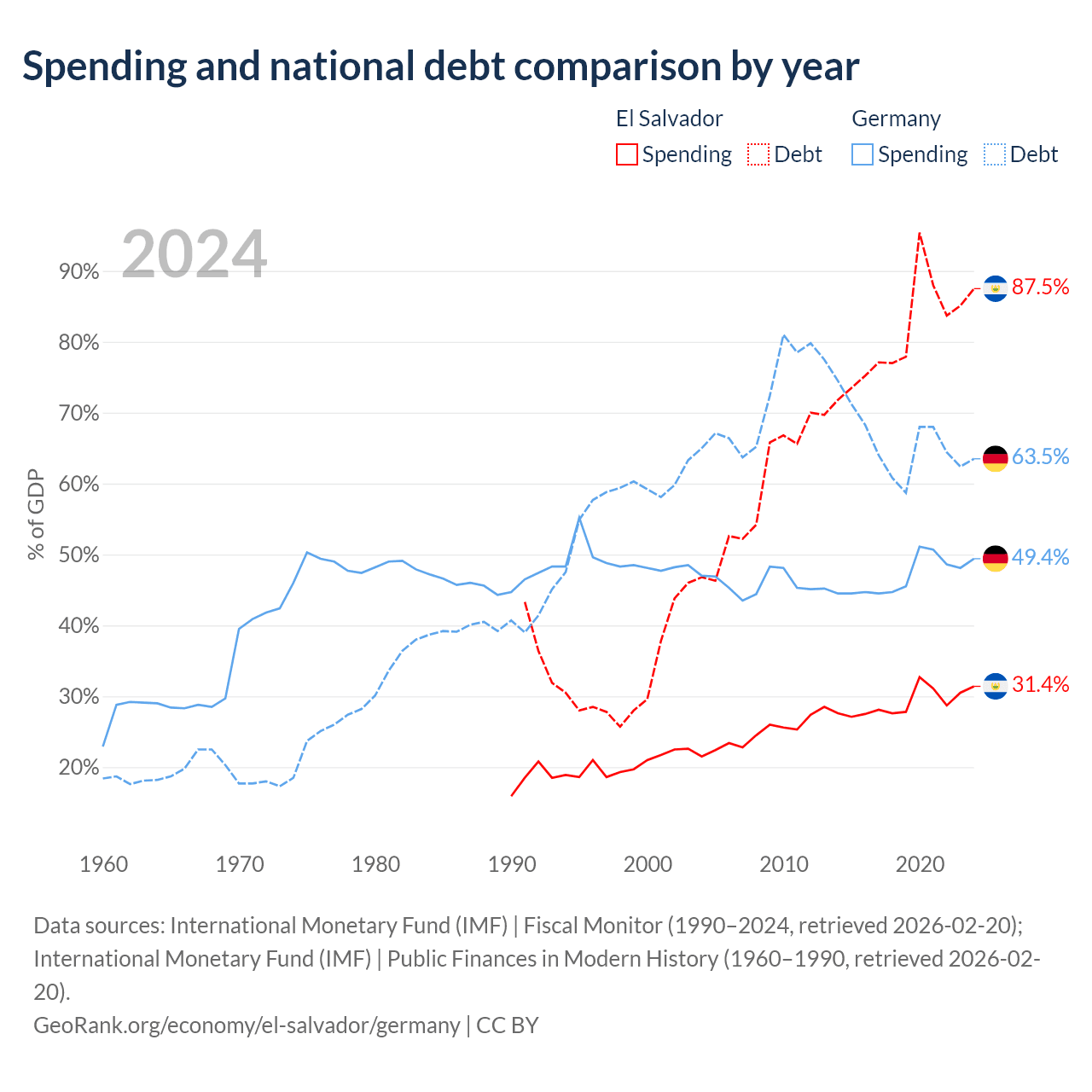 El Salvador has $30.9B in government debt (87.5% of GDP), compared to $2.97T (63.5% of GDP) in Germany.