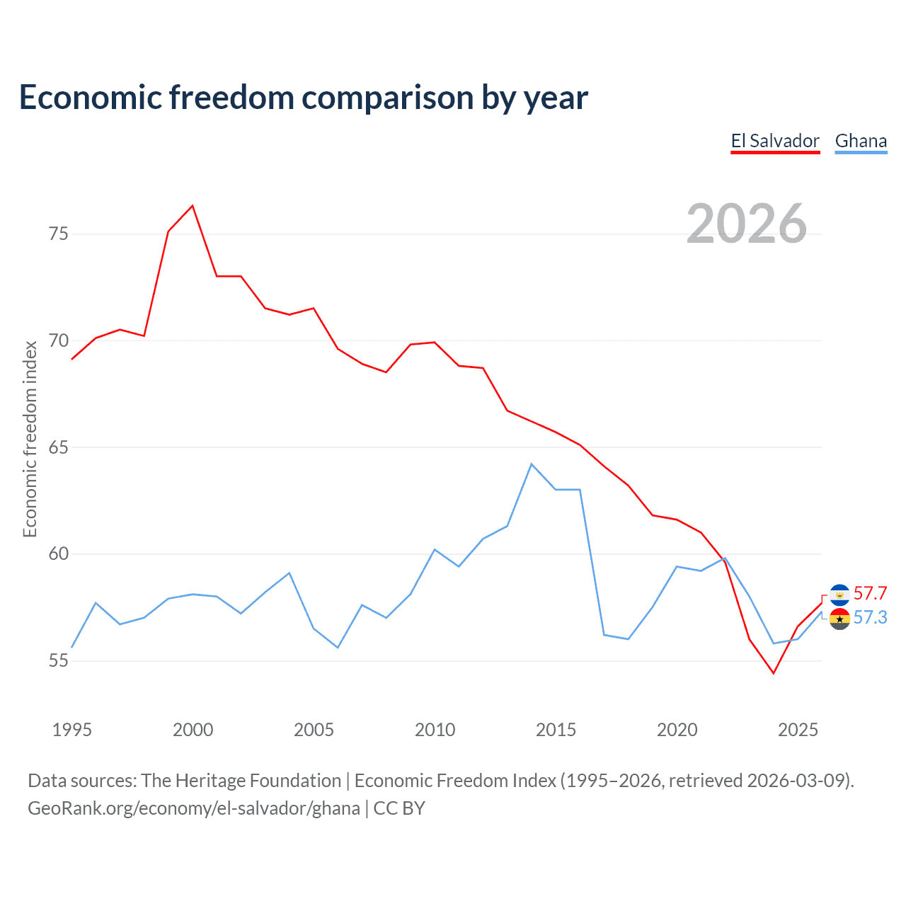 The Economic Freedom Index for El Salvador is 57.7, ranking 114/197, compared to 57.3 for Ghana, ranking 118/197. The chart above displays a comparison of annual changes in economic freedom indexes.