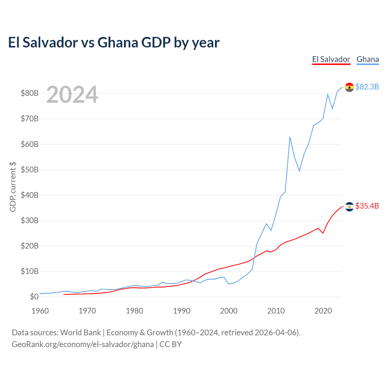 El Salvador has a GDP of $35.4B compared to $82.3B for Ghana, ranking 105/197 and 80/197 by economy size, respectively.