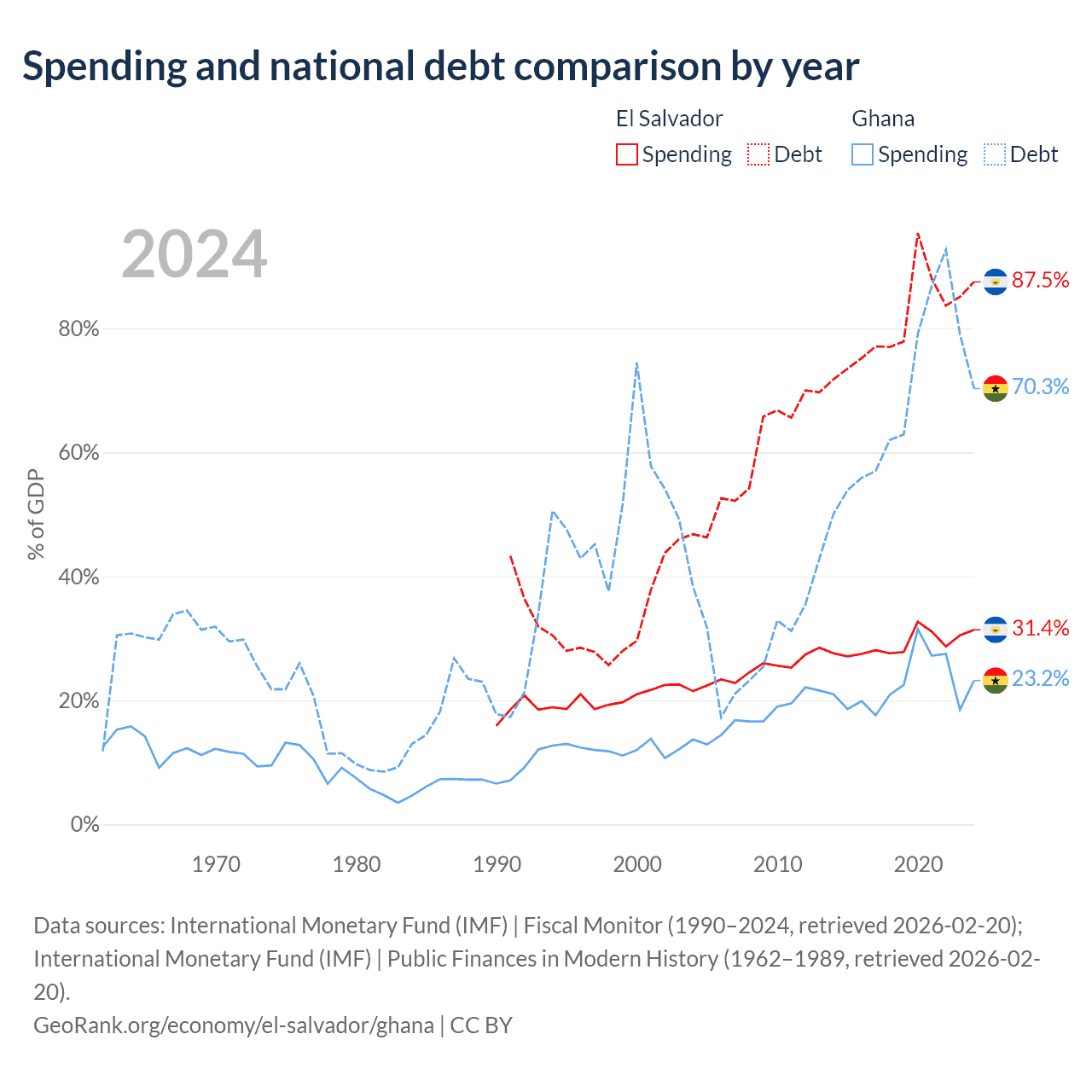 El Salvador has $30.9B in government debt (87.5% of GDP), compared to $57.9B (70.3% of GDP) in Ghana.
