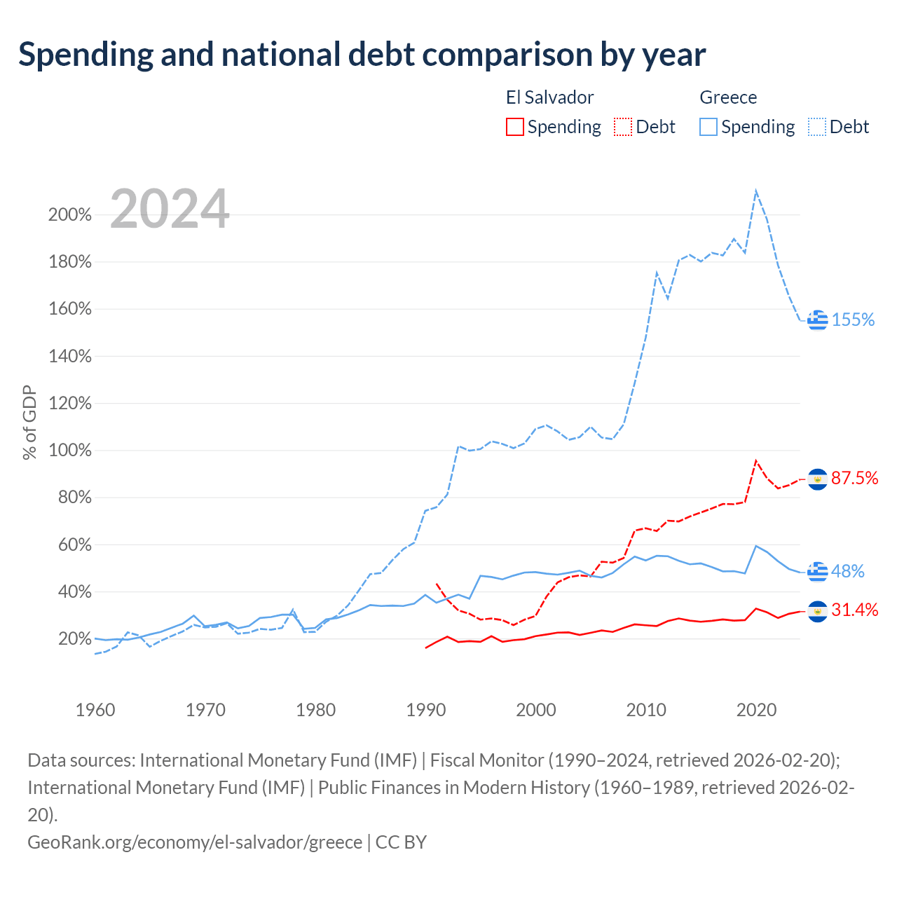 El Salvador has $30.9B in government debt (87.5% of GDP), compared to $397B (154.8% of GDP) in Greece.