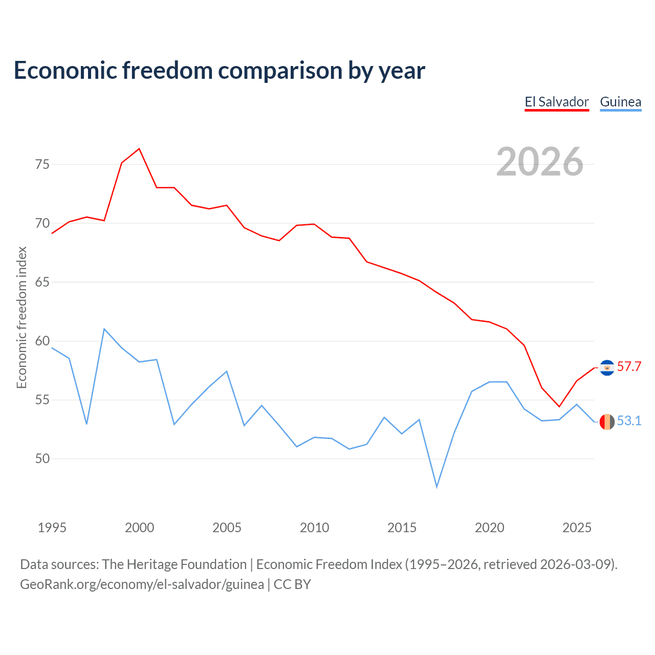 The Economic Freedom Index for El Salvador is 57.7, ranking 114/197, compared to 53.1 for Guinea, ranking 141/197. The chart above displays a comparison of annual changes in economic freedom indexes.