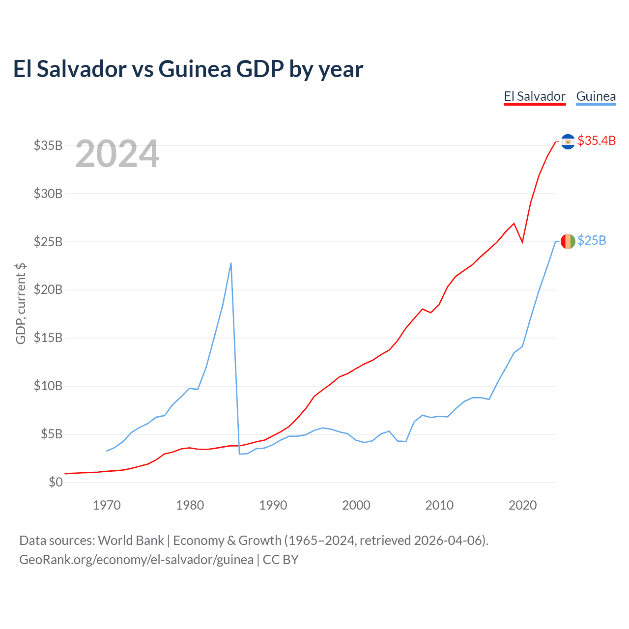 El Salvador has a GDP of $35.4B compared to $25B for Guinea, ranking 105/197 and 118/197 by economy size, respectively.