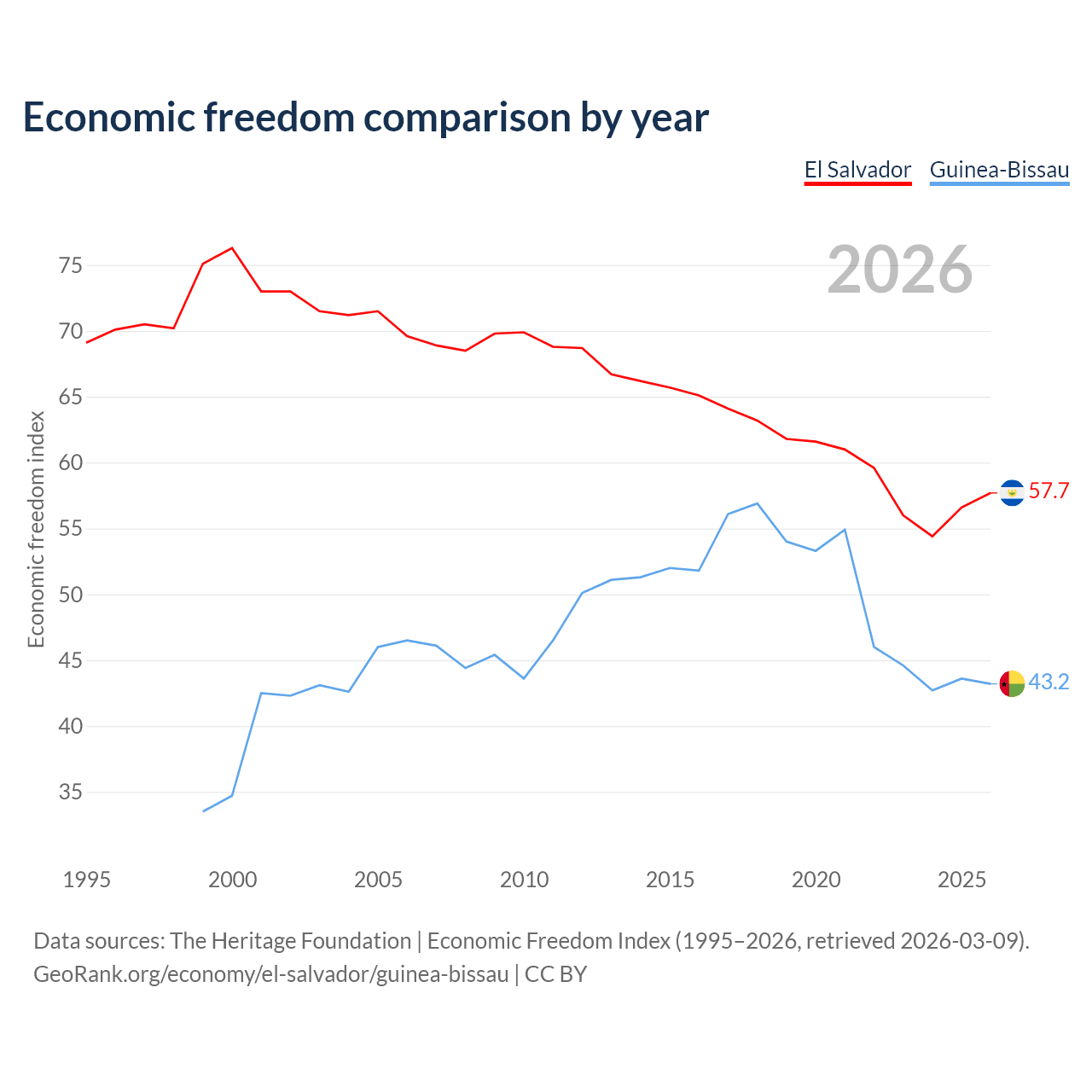 The Economic Freedom Index for El Salvador is 57.7, ranking 114/197, compared to 43.2 for Guinea-Bissau, ranking 181/197. The chart above displays a comparison of annual changes in economic freedom indexes.