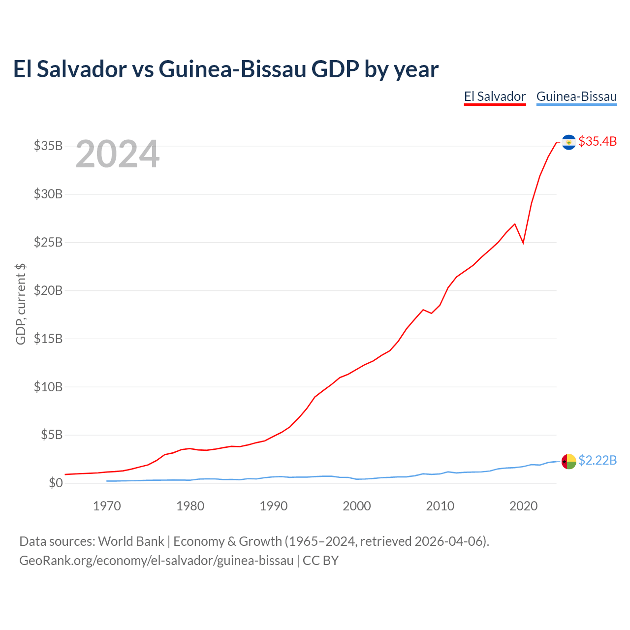 El Salvador has a GDP of $35.4B compared to $2.22B for Guinea-Bissau, ranking 105/197 and 176/197 by economy size, respectively.