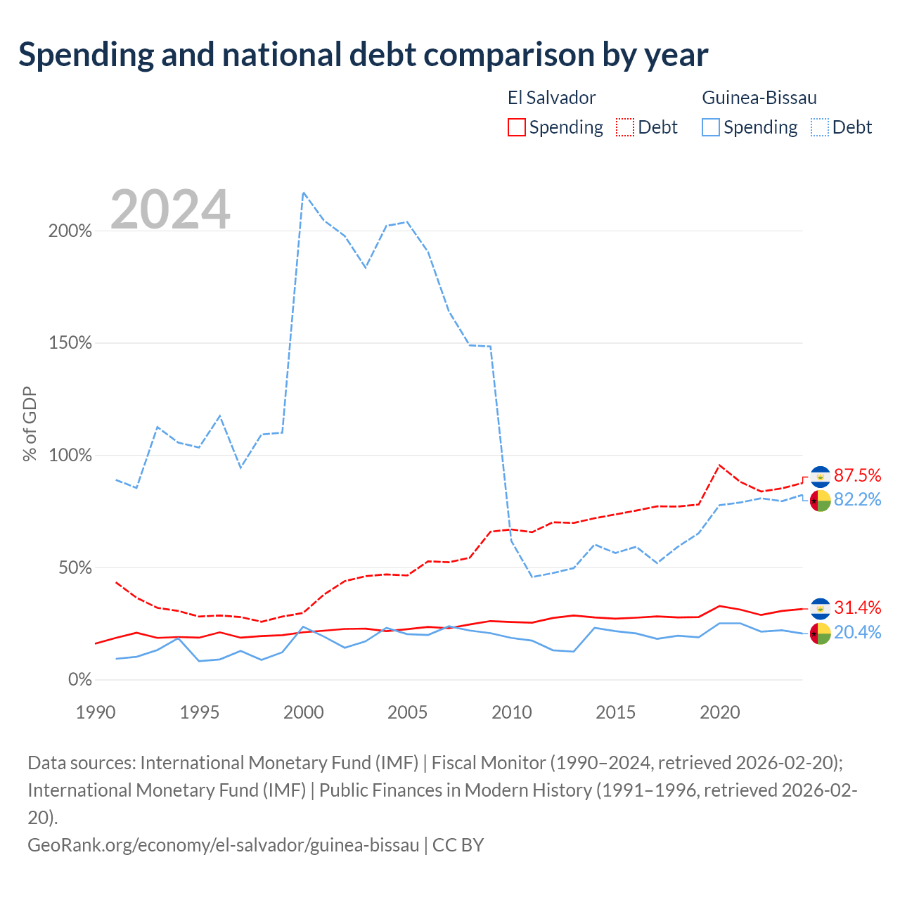 El Salvador has $30.9B in government debt (87.5% of GDP), compared to $1.82B (82.2% of GDP) in Guinea-Bissau.