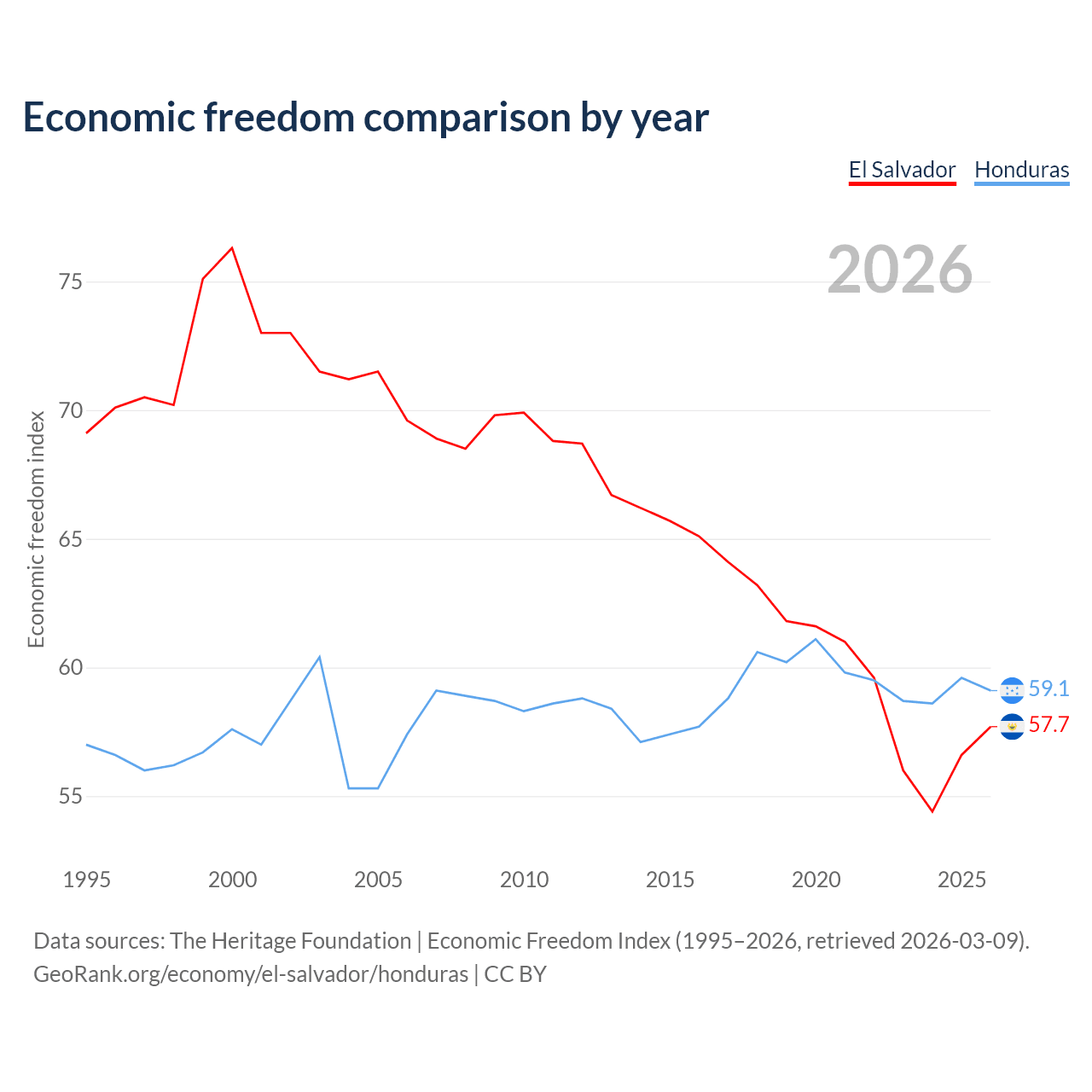 The Economic Freedom Index for El Salvador is 57.7, ranking 114/197, compared to 59.1 for Honduras, ranking 105/197. The chart above displays a comparison of annual changes in economic freedom indexes.