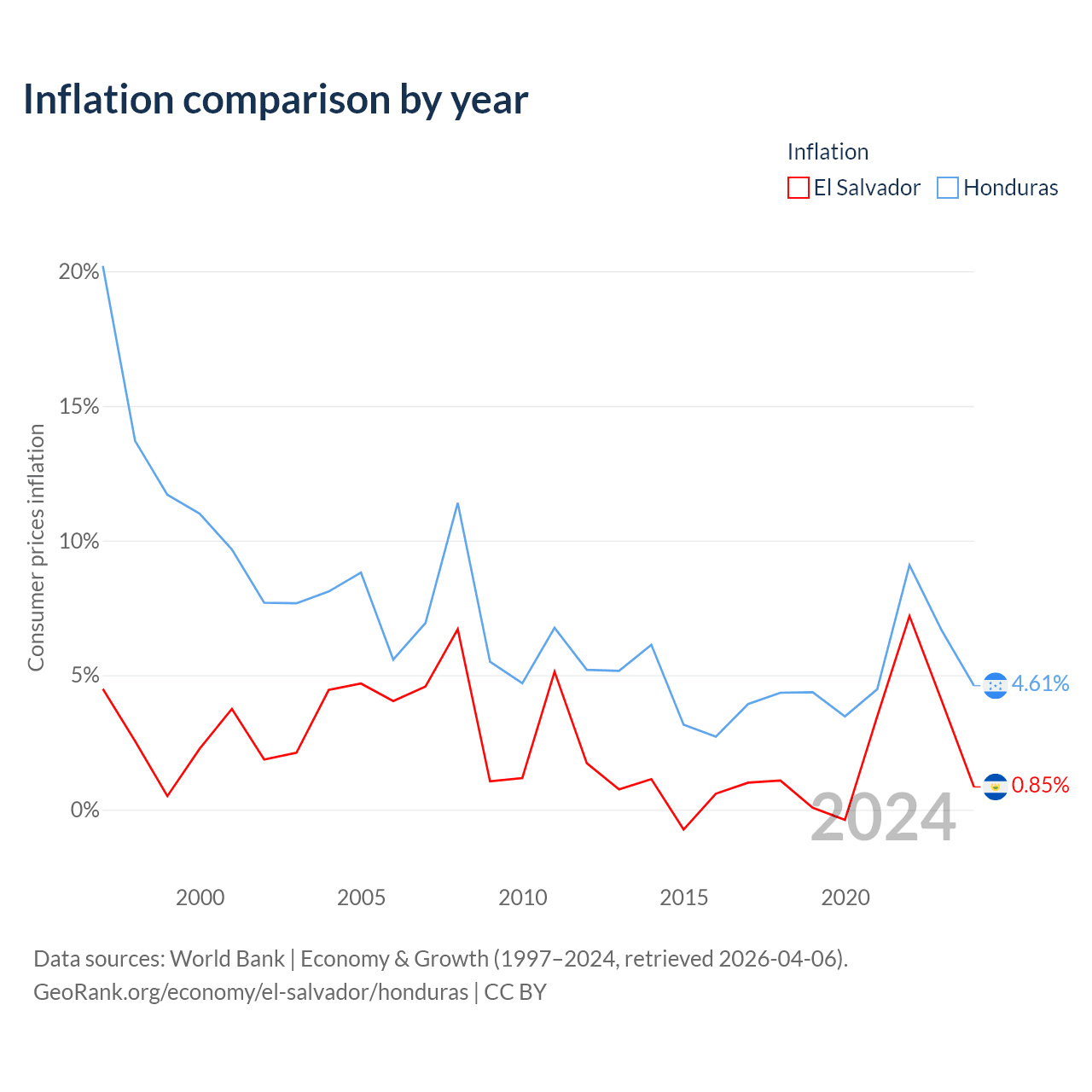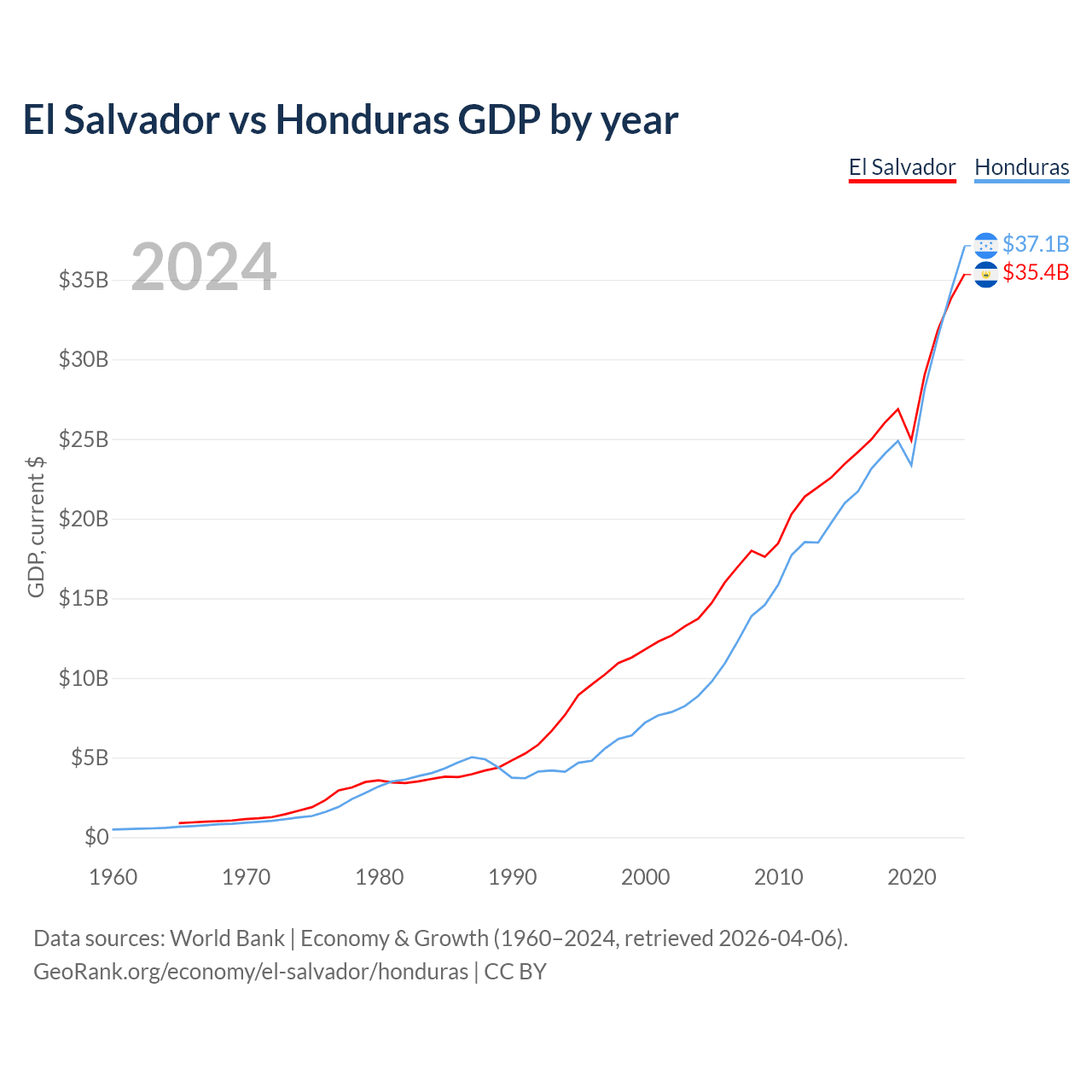 El Salvador has a GDP of $35.4B compared to $37.1B for Honduras, ranking 105/197 and 104/197 by economy size, respectively.