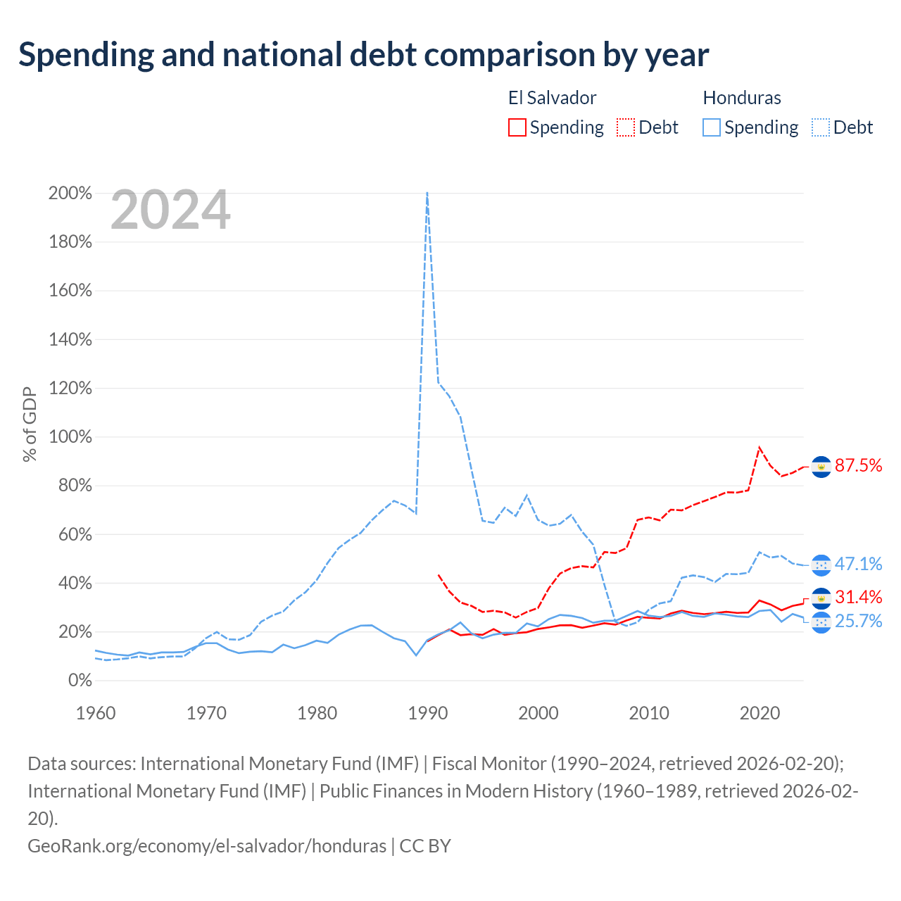El Salvador has $30.9B in government debt (87.5% of GDP), compared to $17.5B (47.1% of GDP) in Honduras.