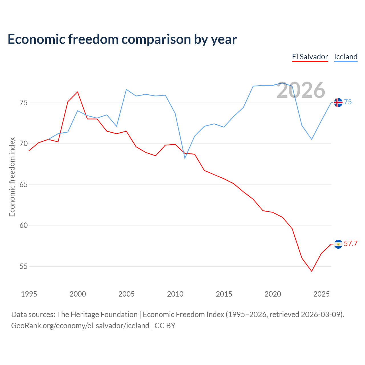 The Economic Freedom Index for El Salvador is 57.7, ranking 114/197, compared to 75 for Iceland, ranking 19/197. The chart above displays a comparison of annual changes in economic freedom indexes.